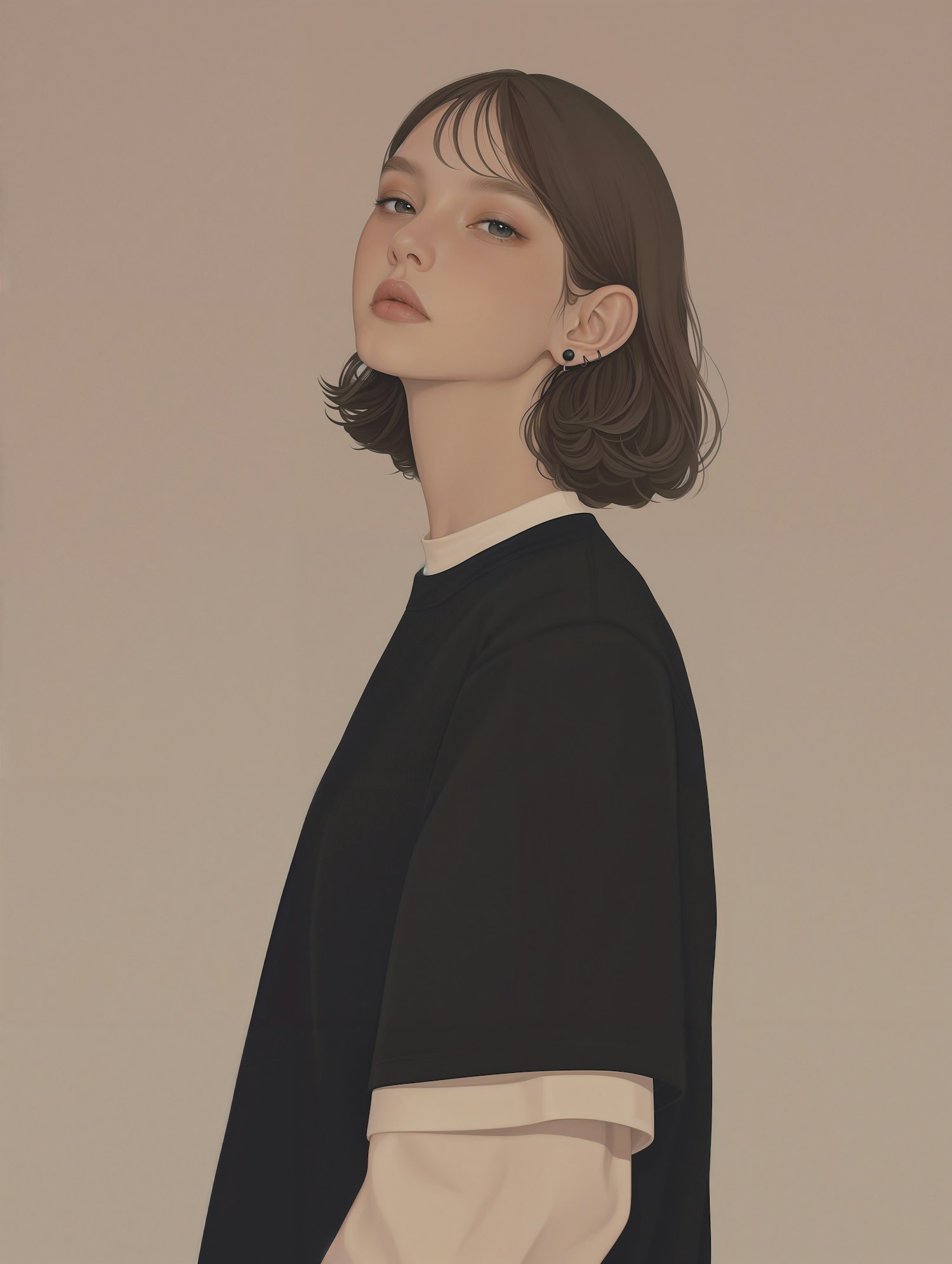 Stylish illustration of a young woman with short brown hair and a minimalist outfit against a beige background.