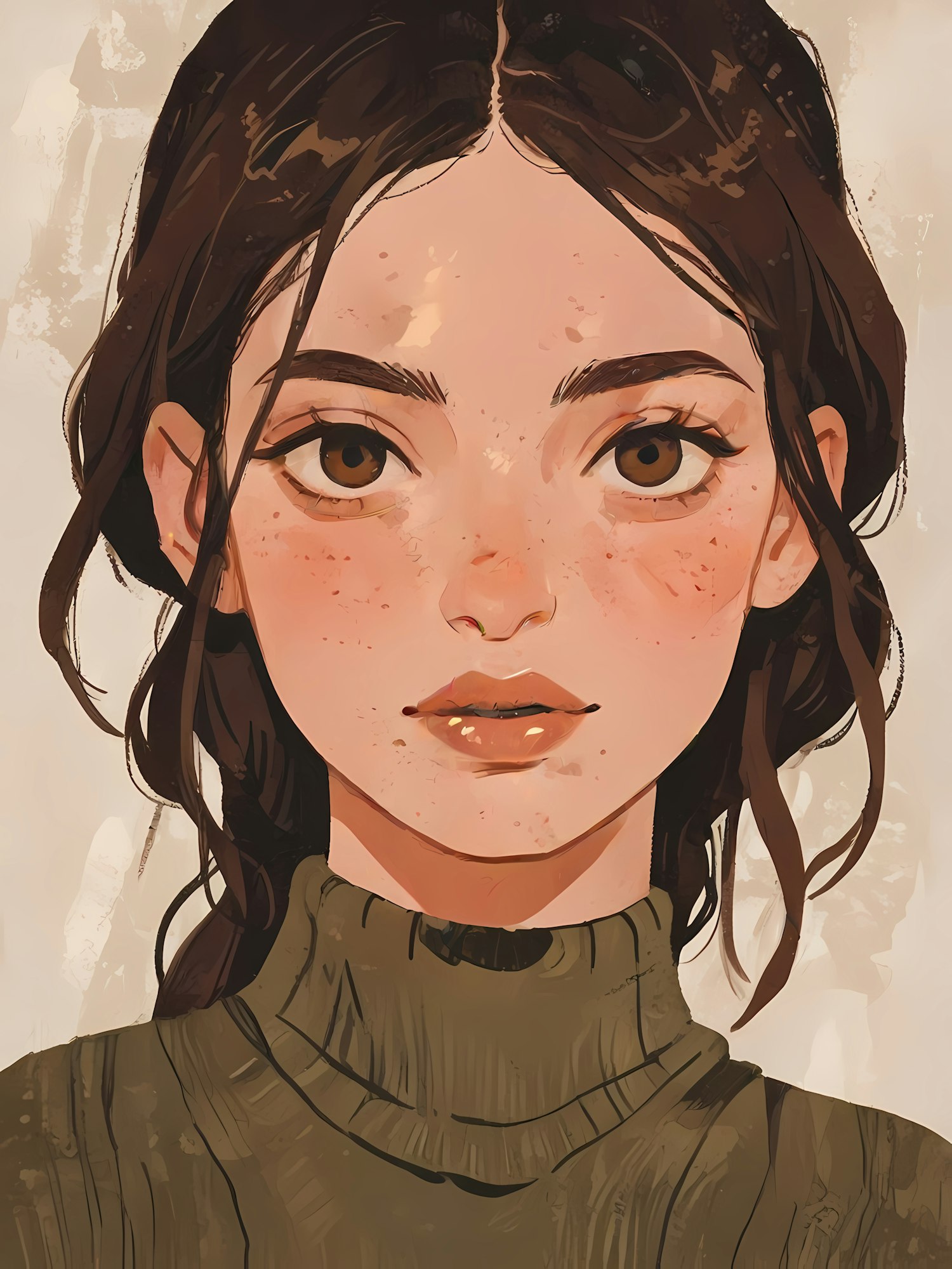 Digital illustration of a young woman with brown hair and eyes, wearing an olive green sweater. Freckles and serene expression.
