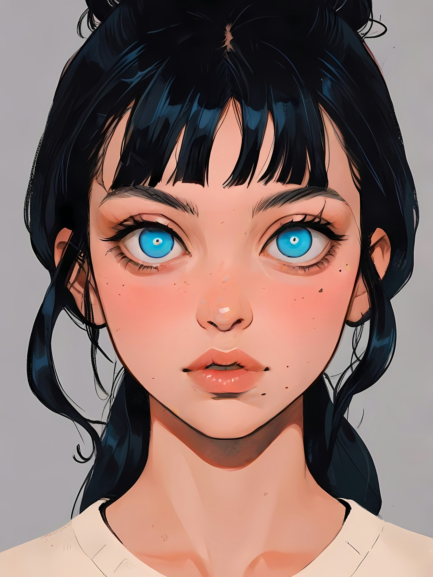 Illustration of a young woman with vivid blue eyes, dark hair, and a fair complexion. Realistic yet stylized digital art portrait.