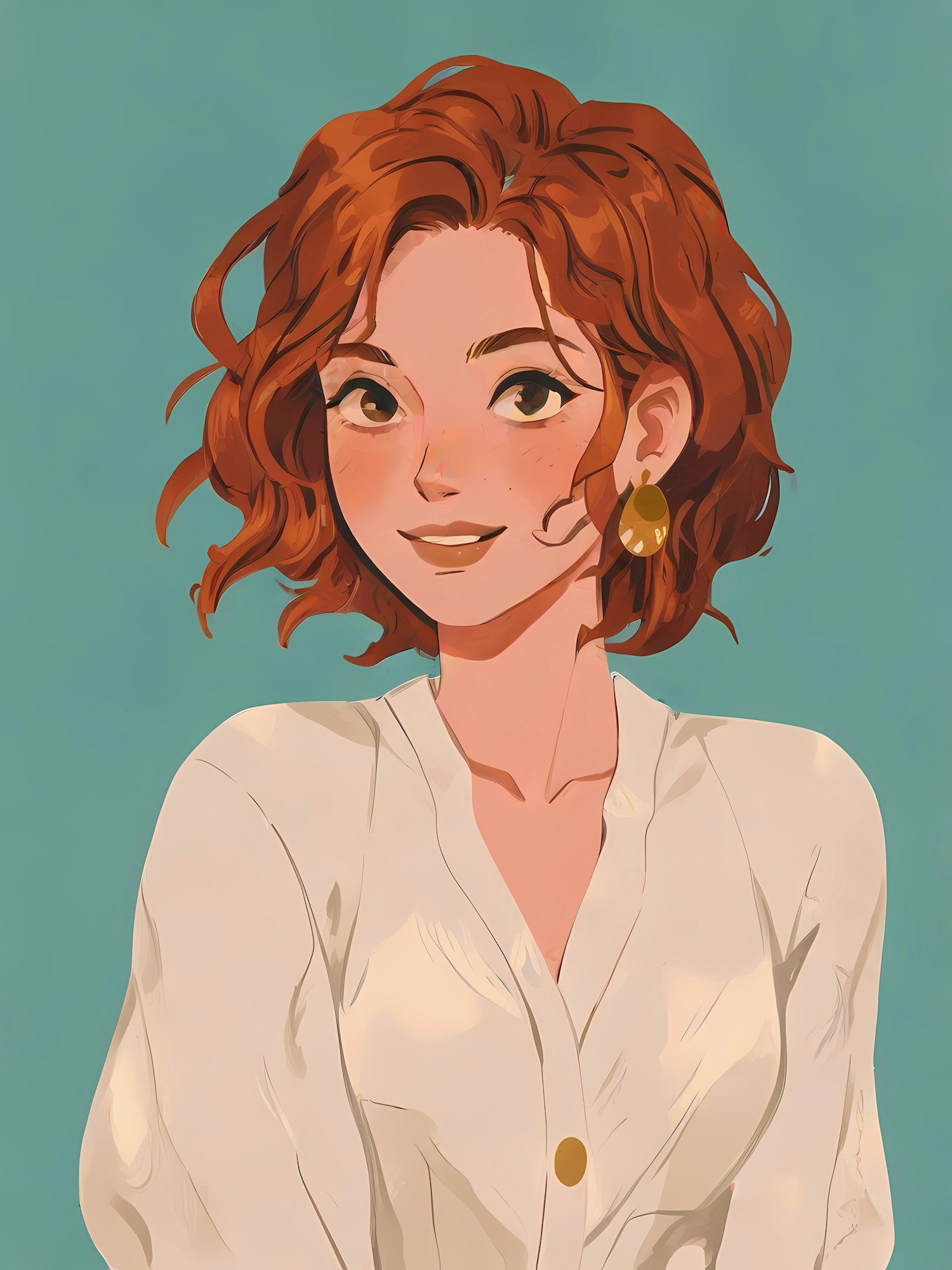 Illustration of a smiling woman with curly red hair, wearing a white blouse and gold earrings against a teal background.