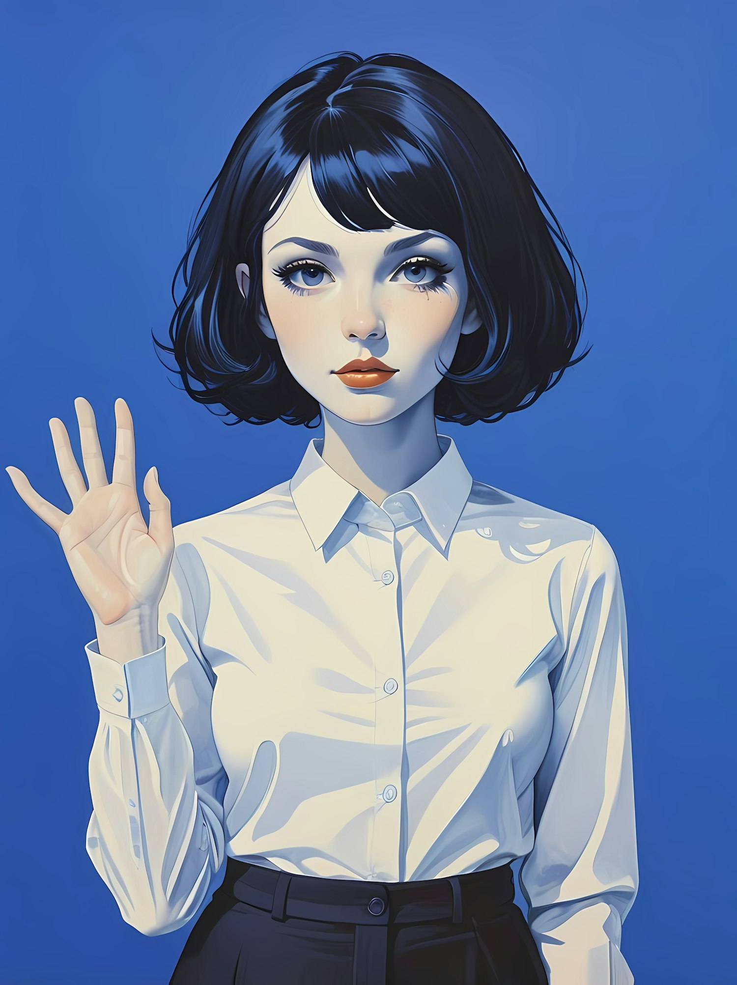 Illustration of a young woman with short black hair and blue eyes, wearing a white shirt, waving against a blue background.
