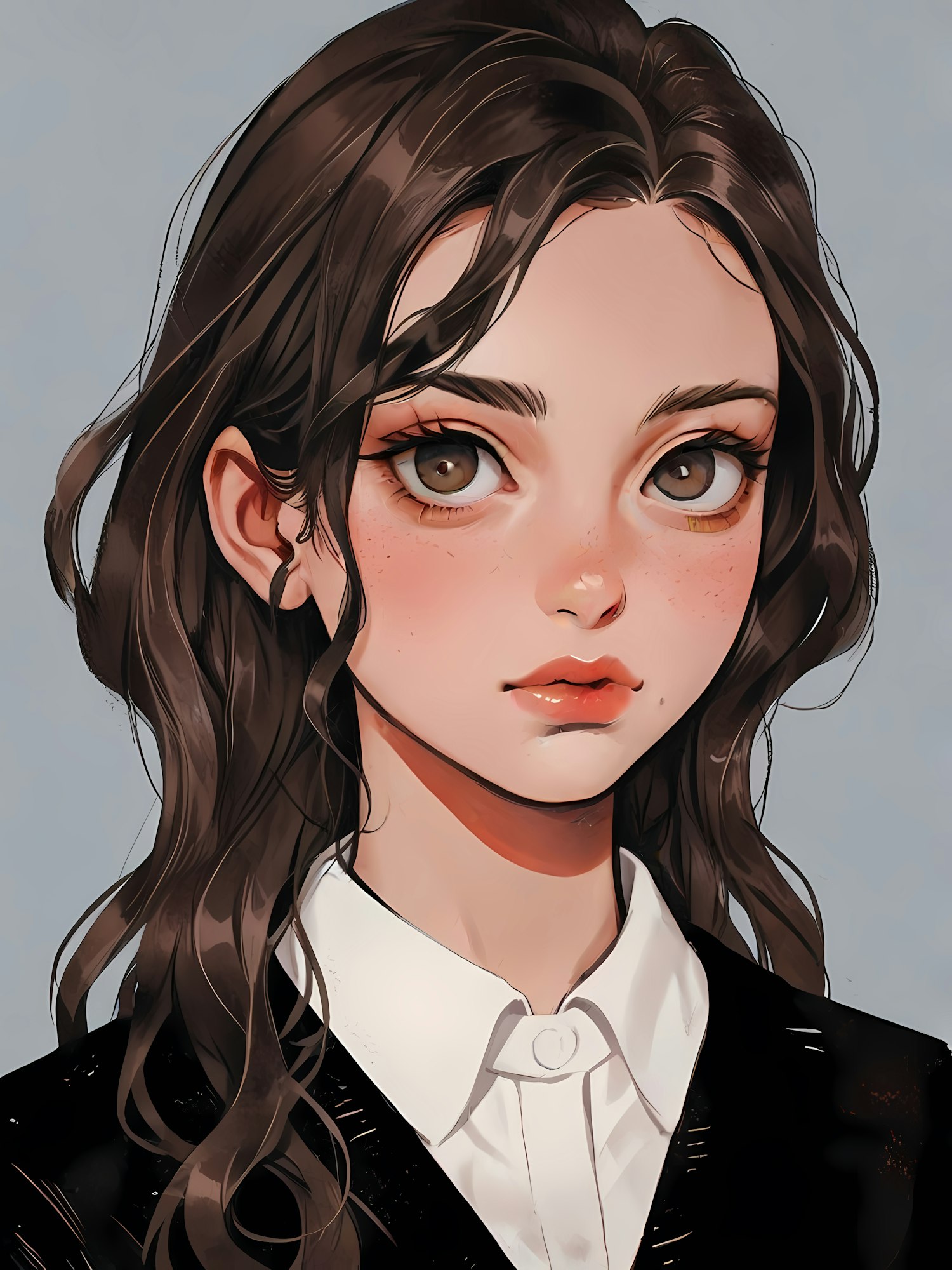 Realistic digital illustration of a young woman with brown hair and eyes, wearing a black jacket and white shirt, against a gray background.