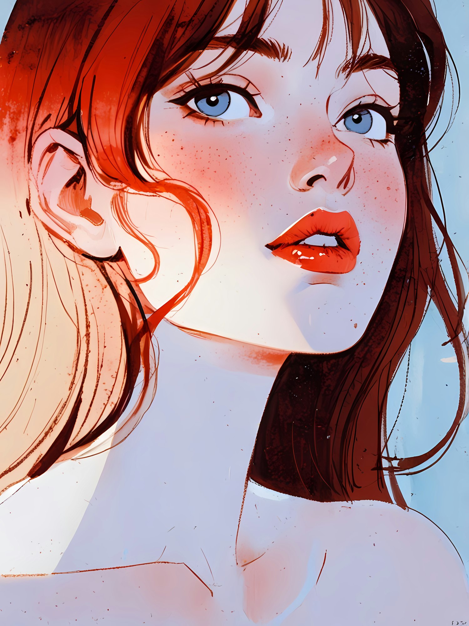 Digital illustration of a freckled woman with red hair, blue eyes, and bold red lips against a soft blue gradient background.