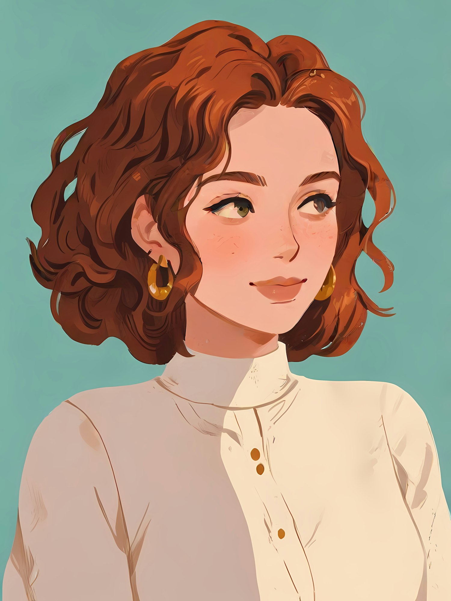 Illustration of a woman with auburn hair, green eyes, and a cream blouse against a teal background. Elegant and serene expression.