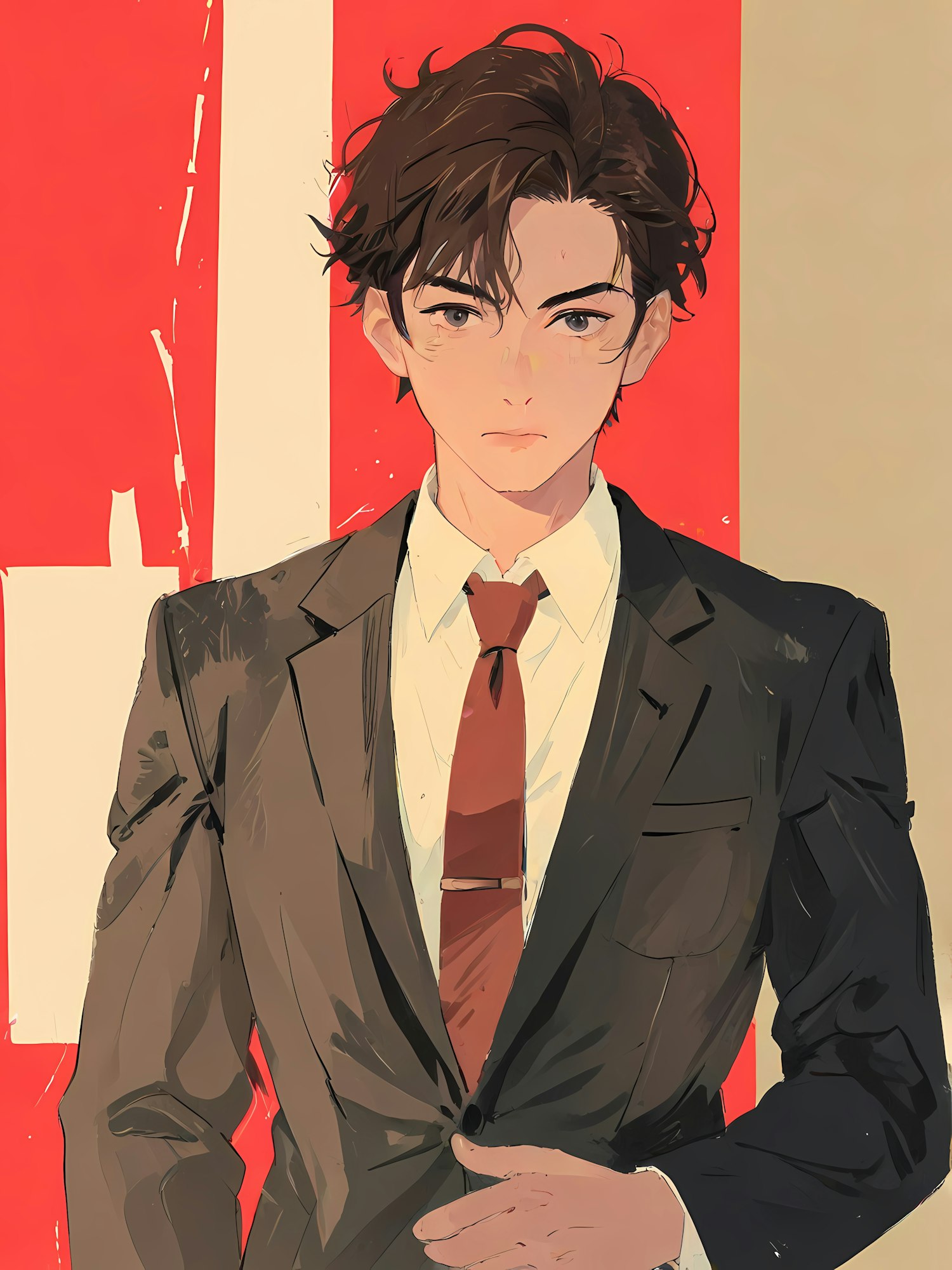 Illustration of a young man in a suit with dark brown hair, against an abstract red and beige background, highlighting bold contrasts.