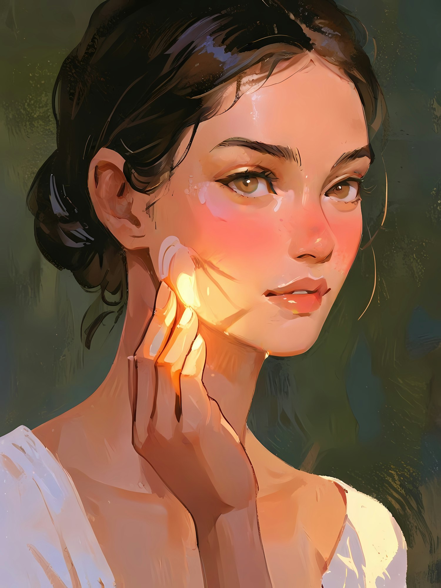 Artful portrait of a woman with radiant skin, dark hair, and a glowing touch, set against a textured green backdrop.