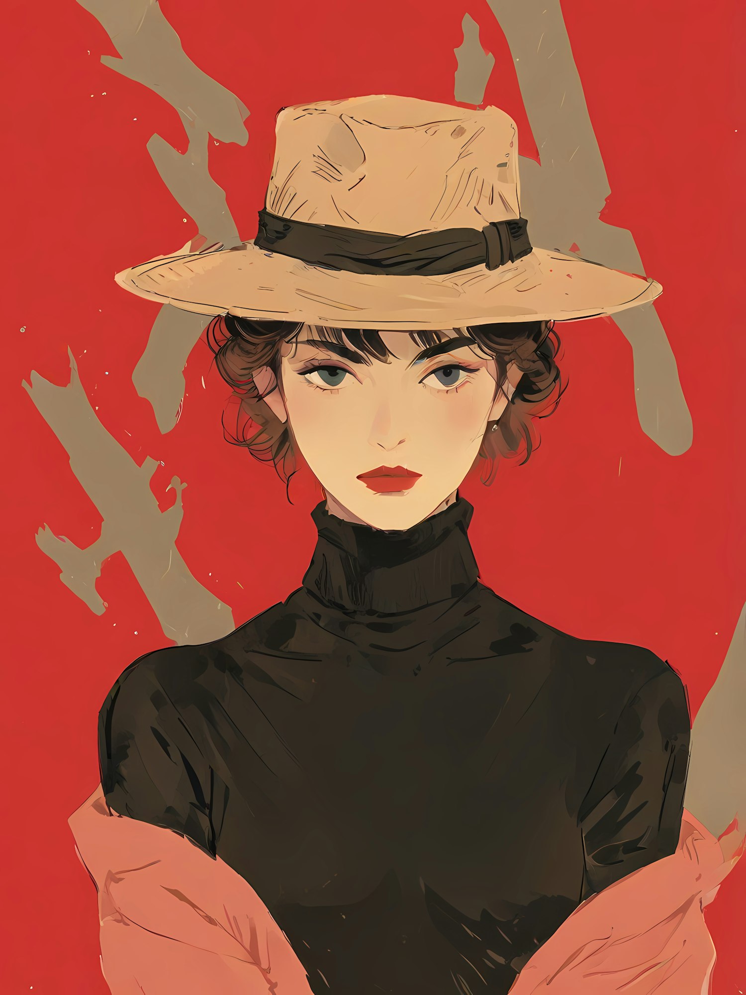Stylish illustrative portrait with bold reds and beige tones, featuring a person in a hat and turtleneck.