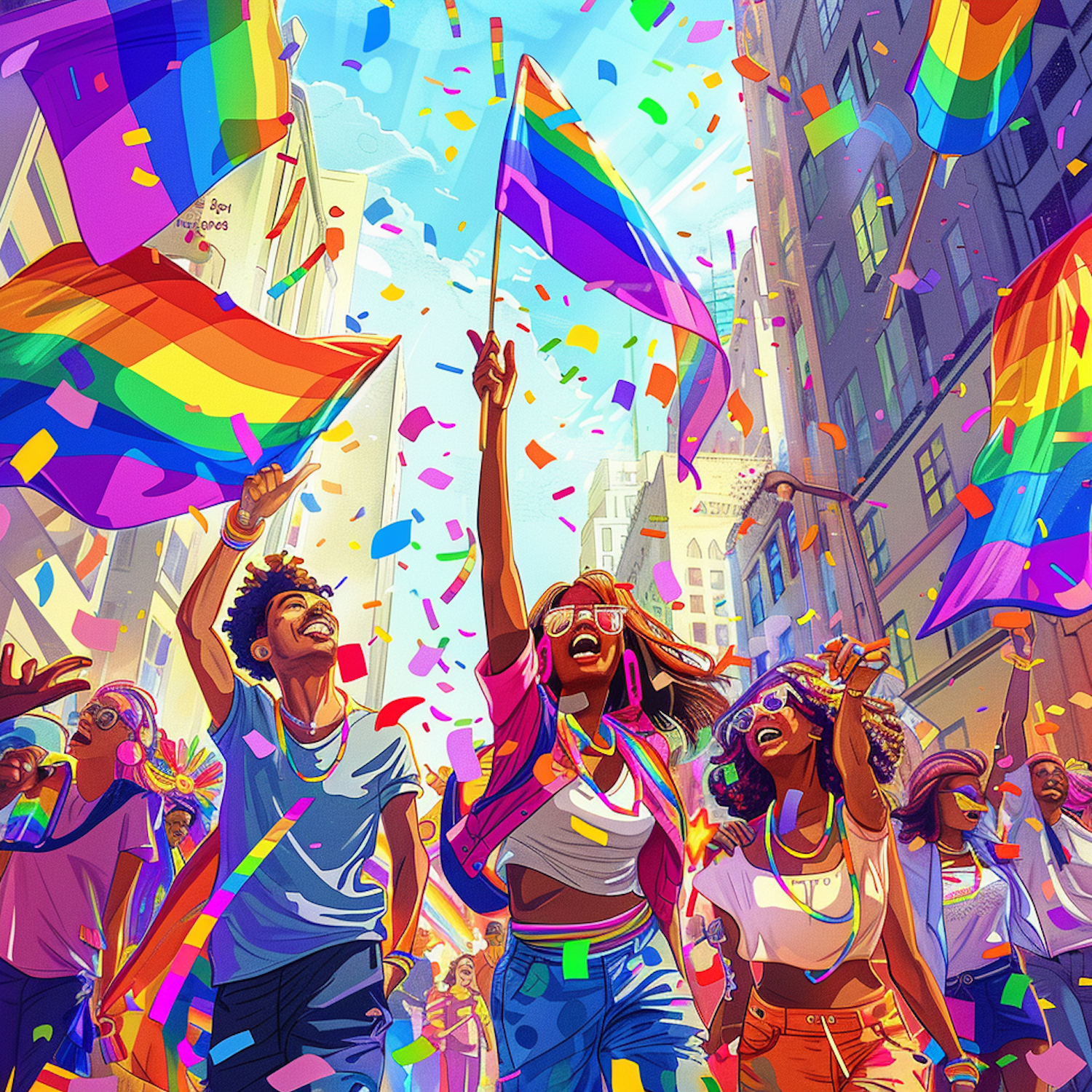Vibrant pride parade with diverse participants waving rainbow flags and celebrating under a confetti-filled sky in a bustling city street.