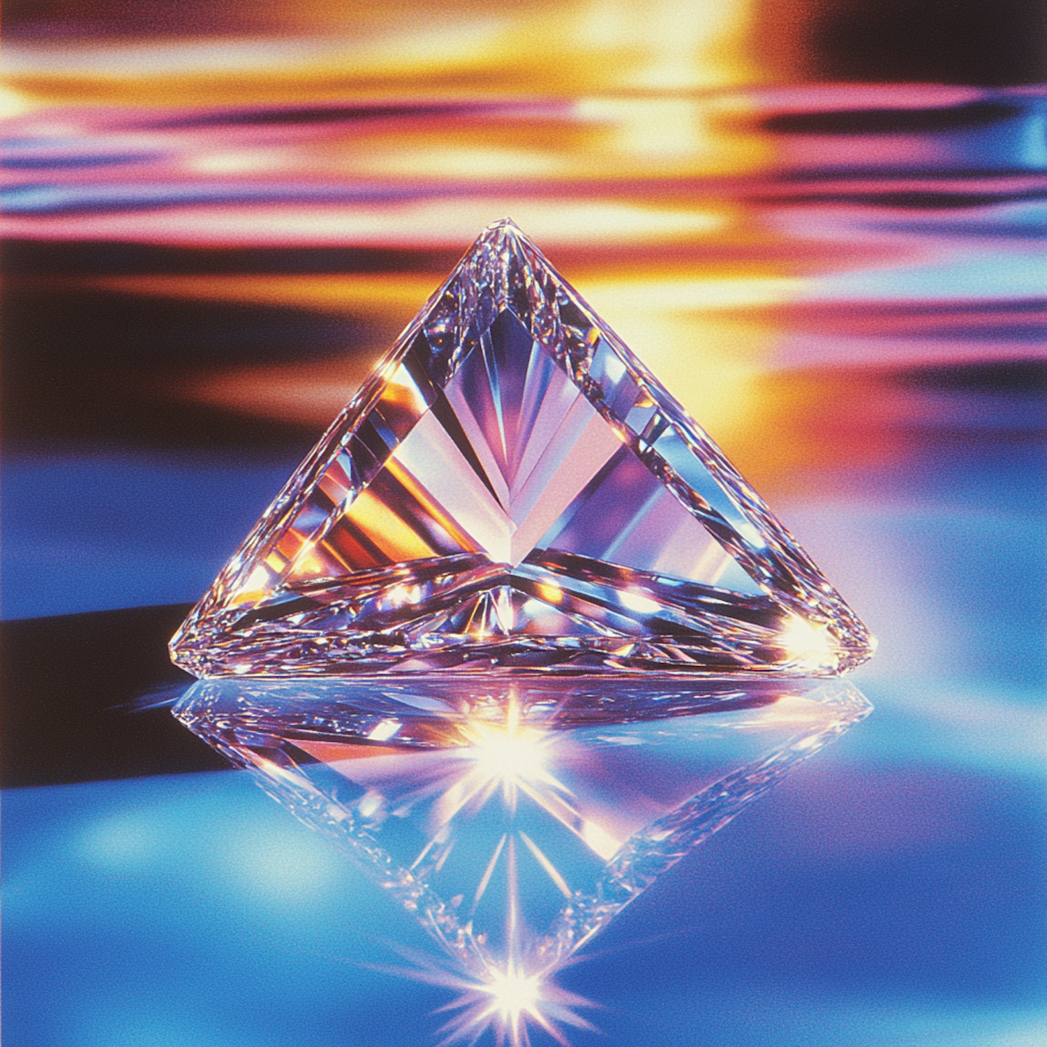 A triangular crystal prism refracts vibrant light on a reflective surface, blending warm and cool tones in a mesmerizing display.