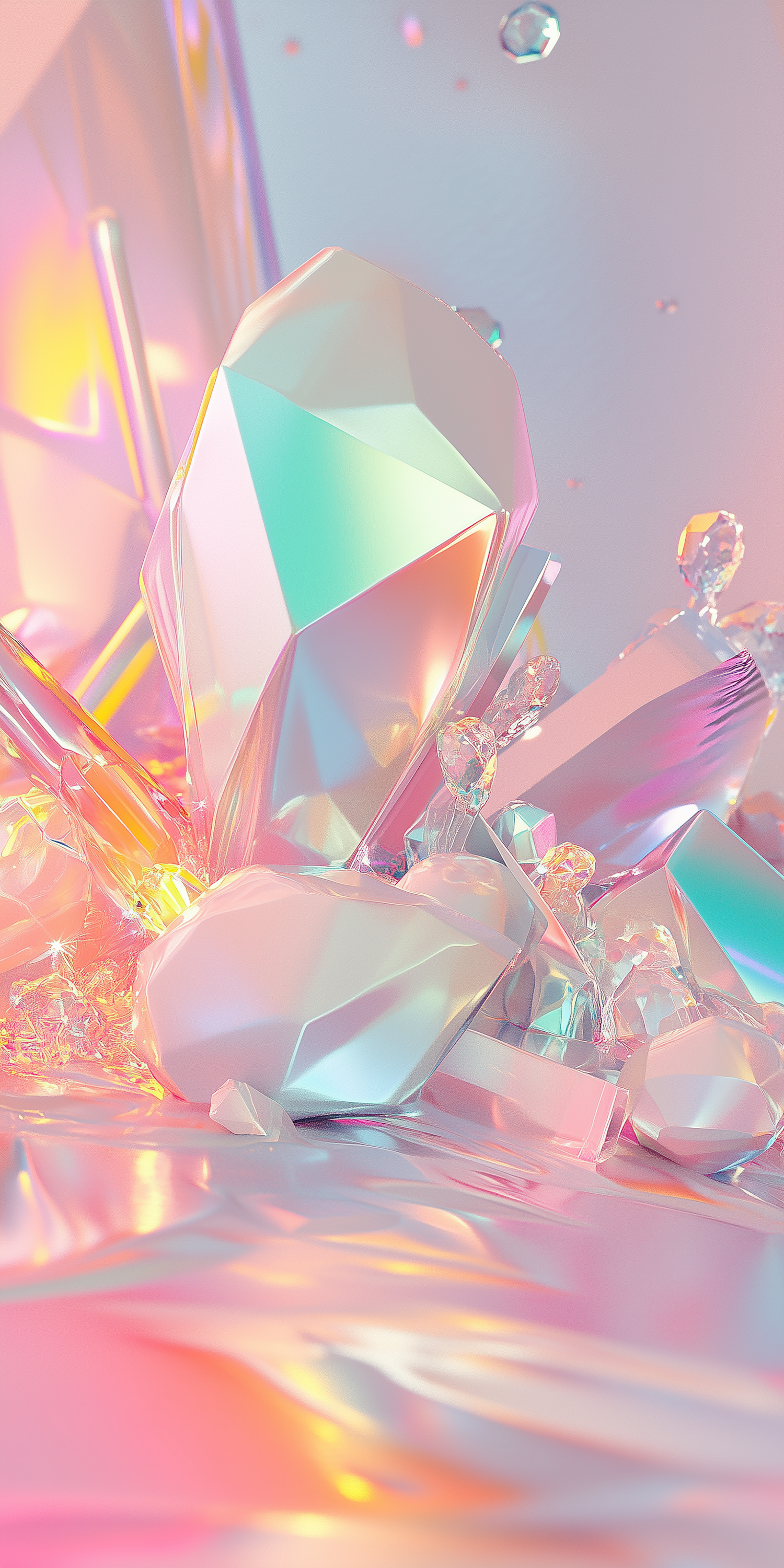 A dreamy 3D rendering of pastel-hued crystals with iridescent reflections, creating a soft, ethereal, and futuristic aesthetic.