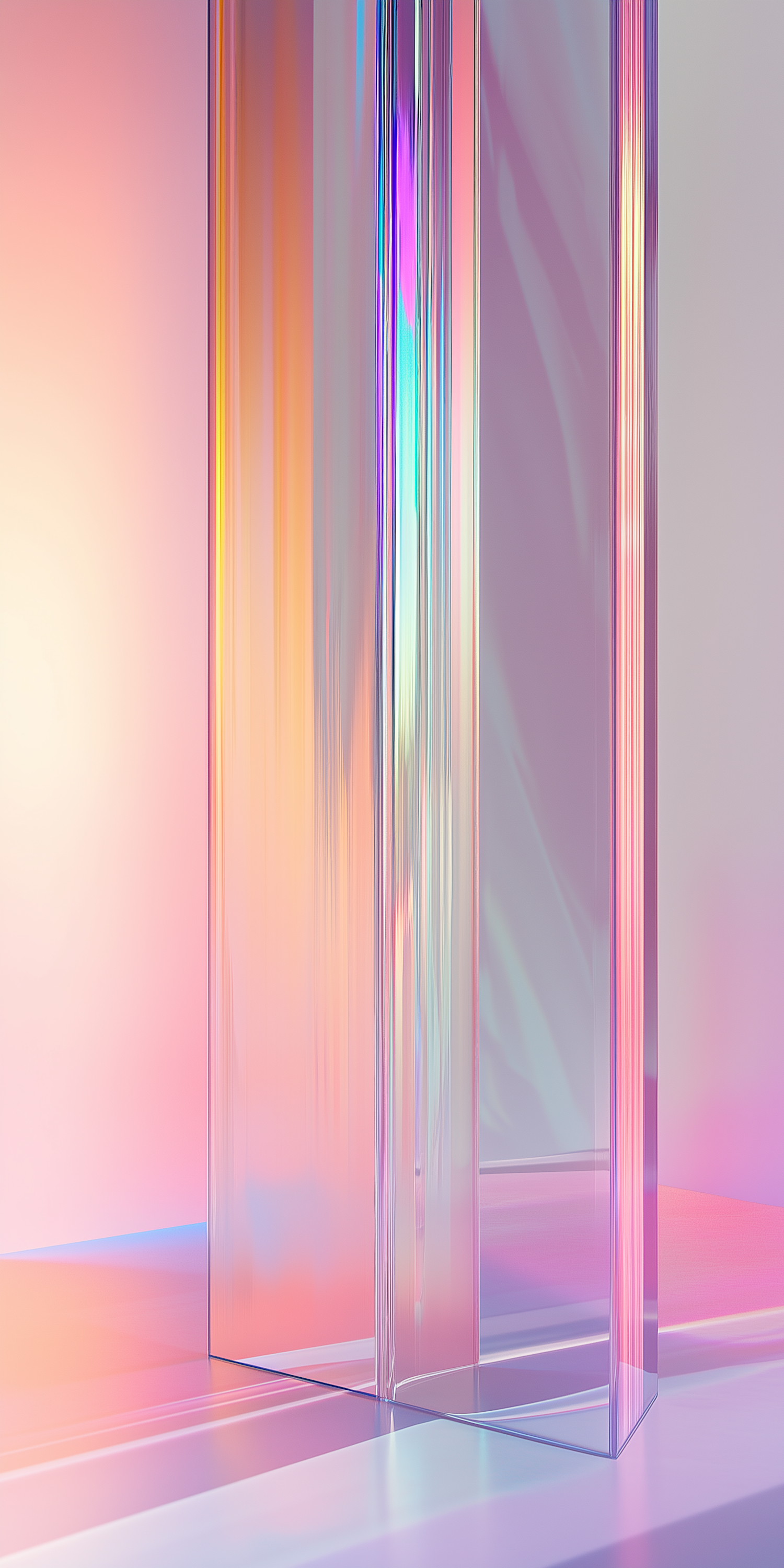 Abstract glass-like structures refract pastel light, creating a serene, futuristic vibe with soft pink, purple, and blue hues.