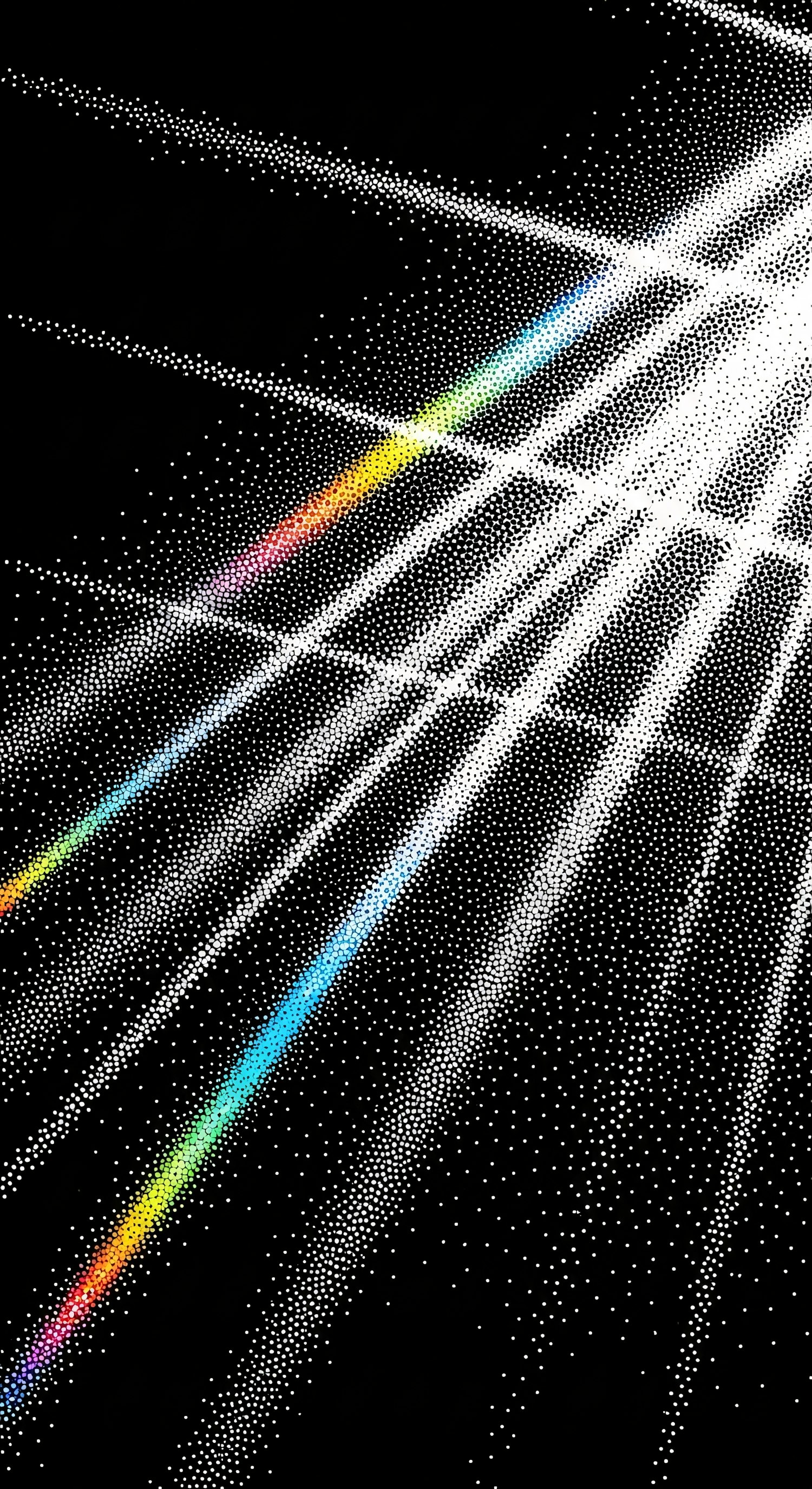 Abstract pointillistic illustration of light beams and a spectrum of colors on a black background, evoking light dispersion.