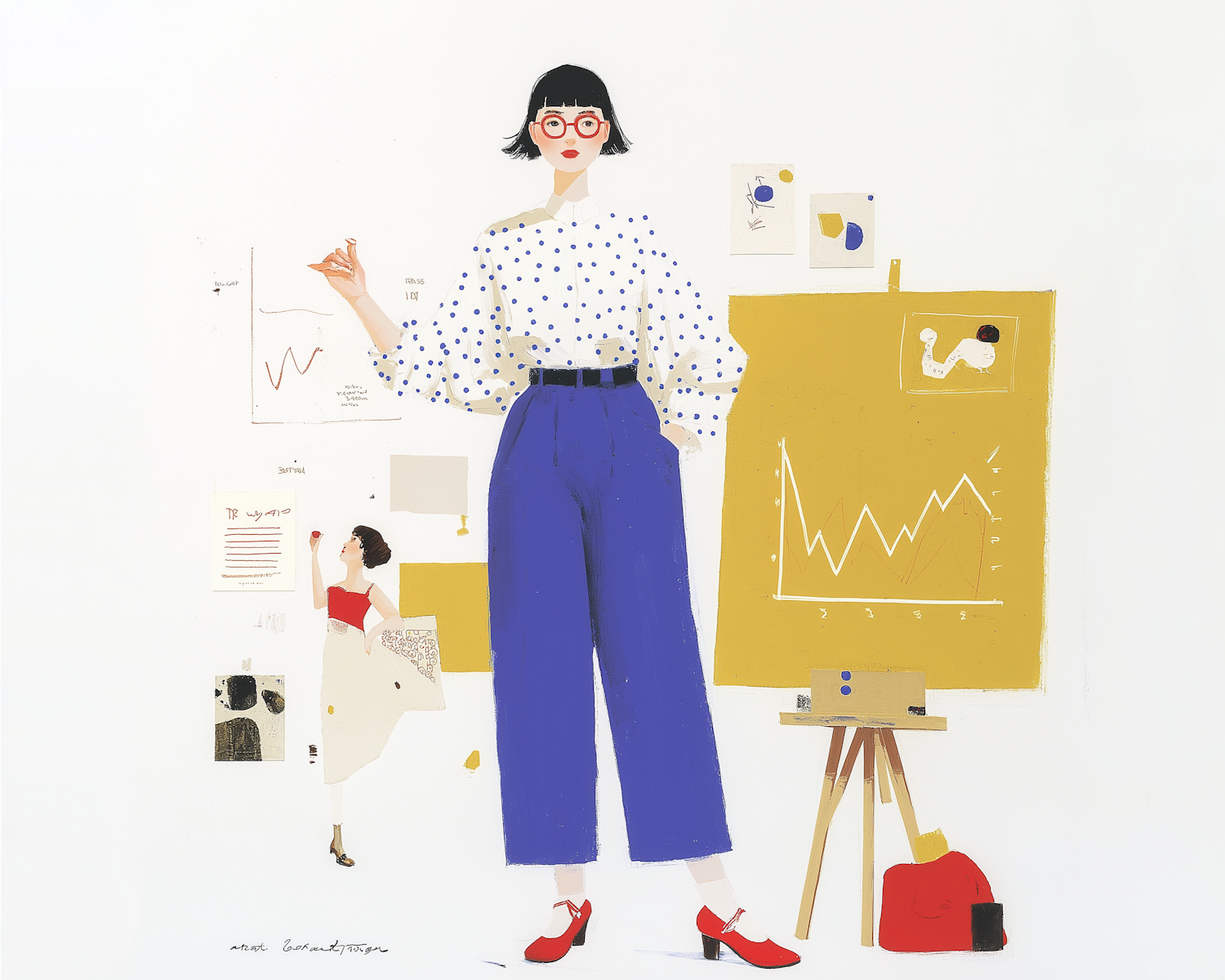 Stylish illustration of a professional woman in a creative workspace, featuring bold colors and a modern aesthetic.