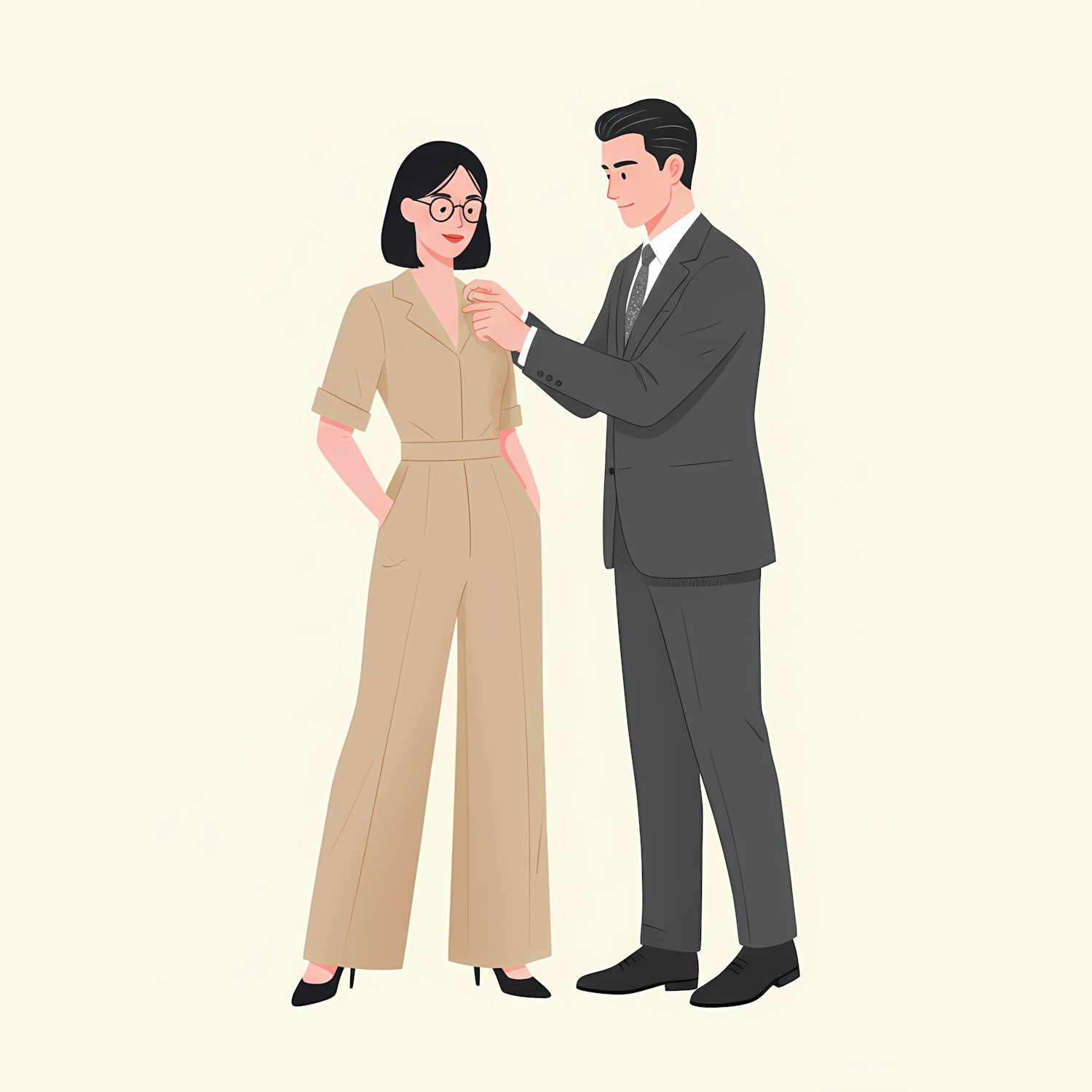 Illustration of a professional interaction between a man in a suit and a woman in a beige jumpsuit, set against a light background.