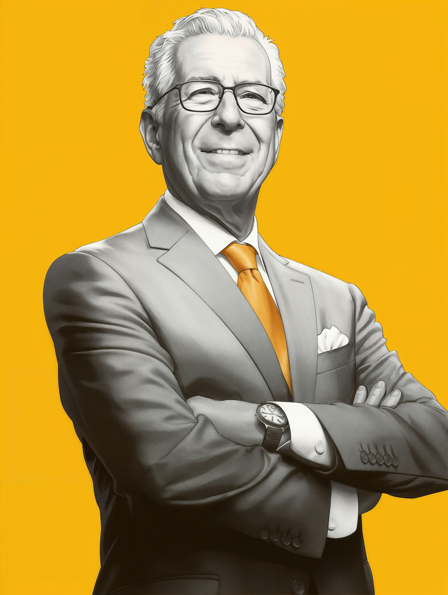 Stylish illustration of a confident man in a gray suit with an orange tie, set against a bold yellow background.