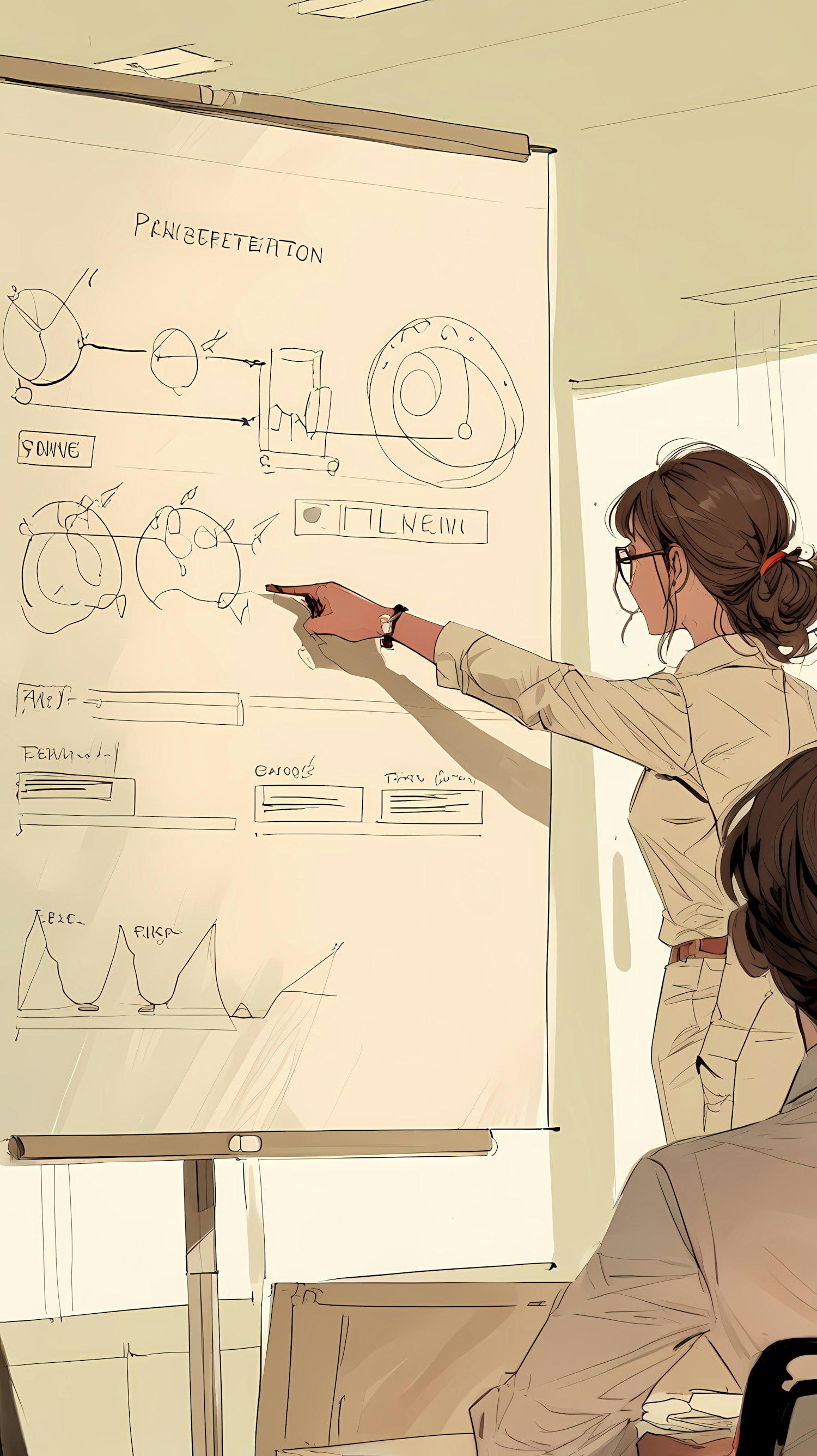Illustration of a professional presentation session with a female presenter using a diagram on a flip chart, set in a modern office.