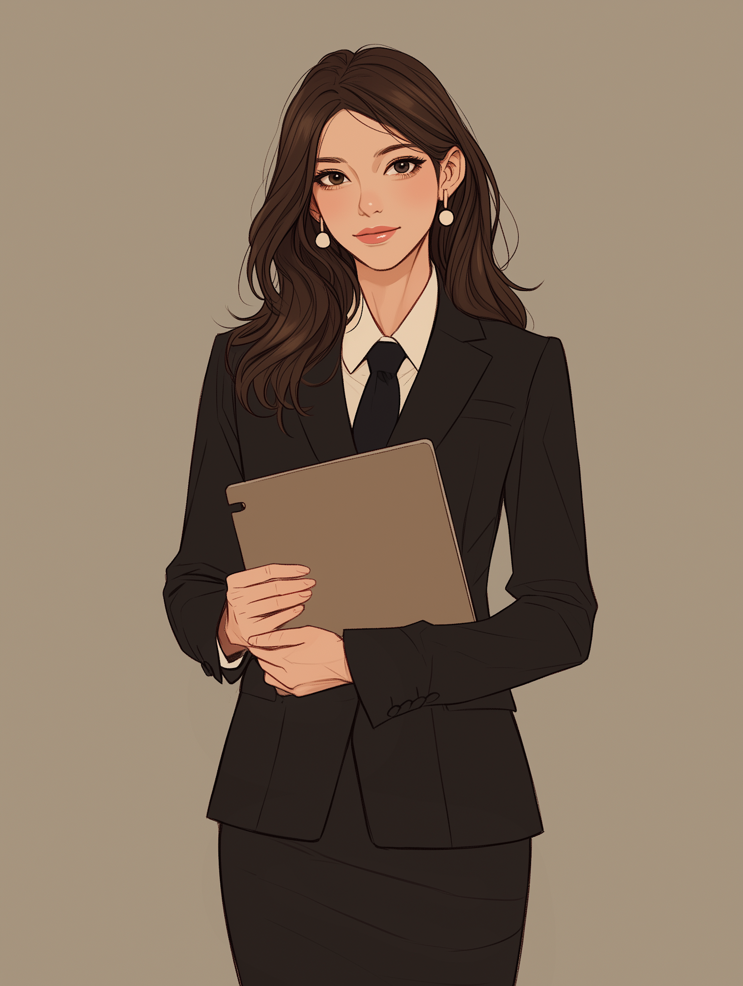 Illustration of a professional woman in a black suit holding a folder, exuding confidence and elegance.