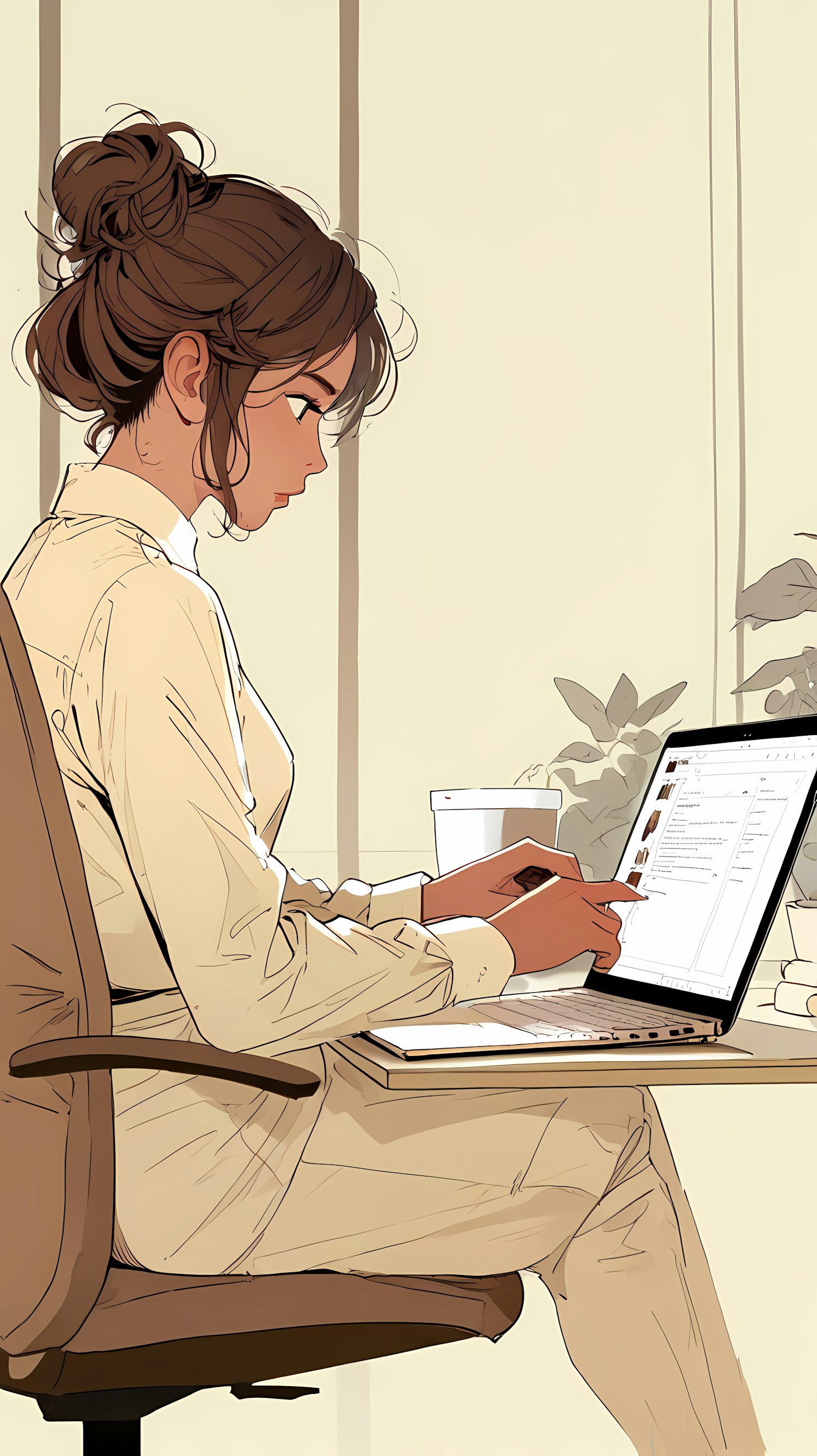 A professional digital illustration of a woman working on a laptop in a serene office environment with a clean and minimalistic look.
