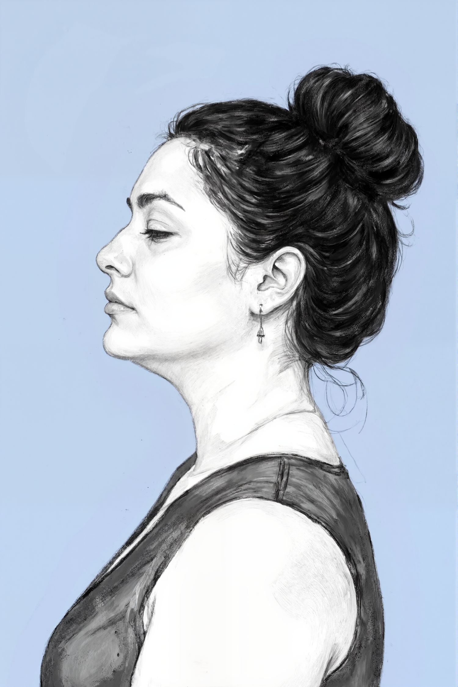 Realistic profile illustration of a serene woman with dark hair in a bun, wearing a sleeveless top and earring, set against a light blue background.
