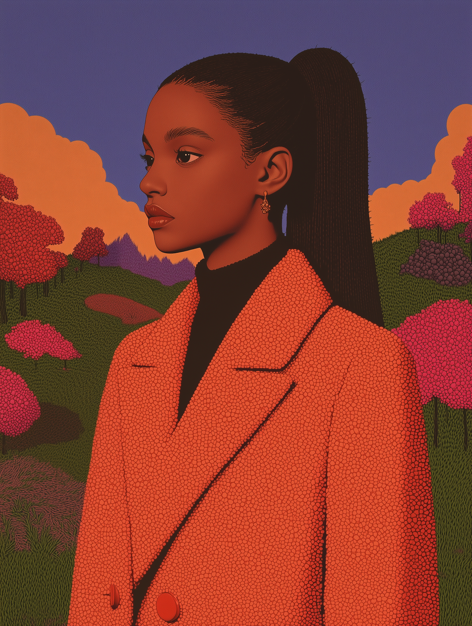 Stylized portrait of a young Black woman in an orange coat against a vibrant landscape with colorful trees and sky.