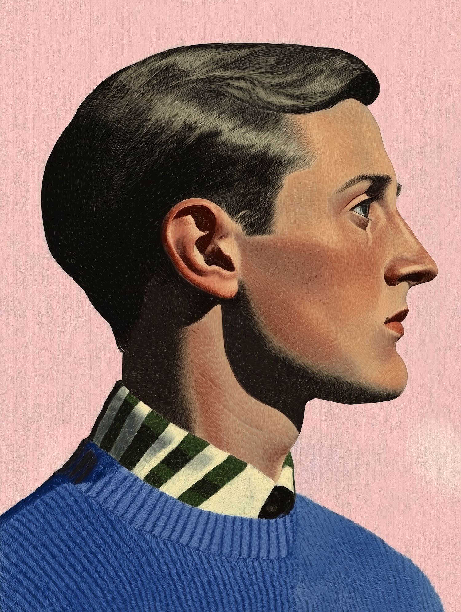 Stylized profile illustration of a young man with dark hair, wearing a blue sweater and striped shirt, set against a pink background.