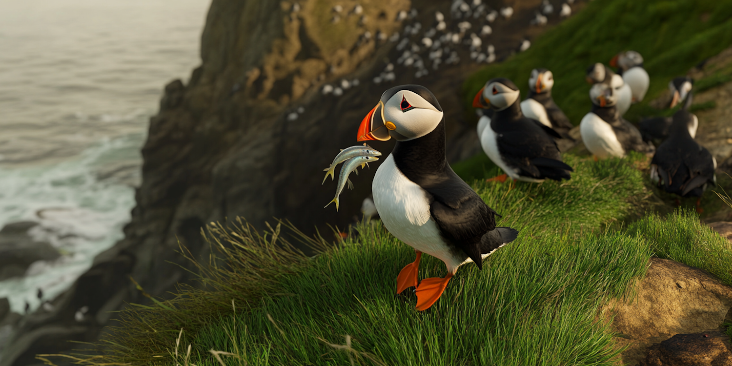Puffins on a green cliffside with ocean view, one holding a fish. Vibrant colors and serene coastal scene.