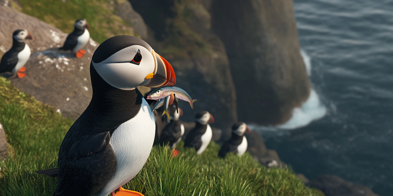 Puffins on a grassy cliff with one holding a fish, overlooking the ocean. Vibrant colors and dynamic scene with crashing waves below.
