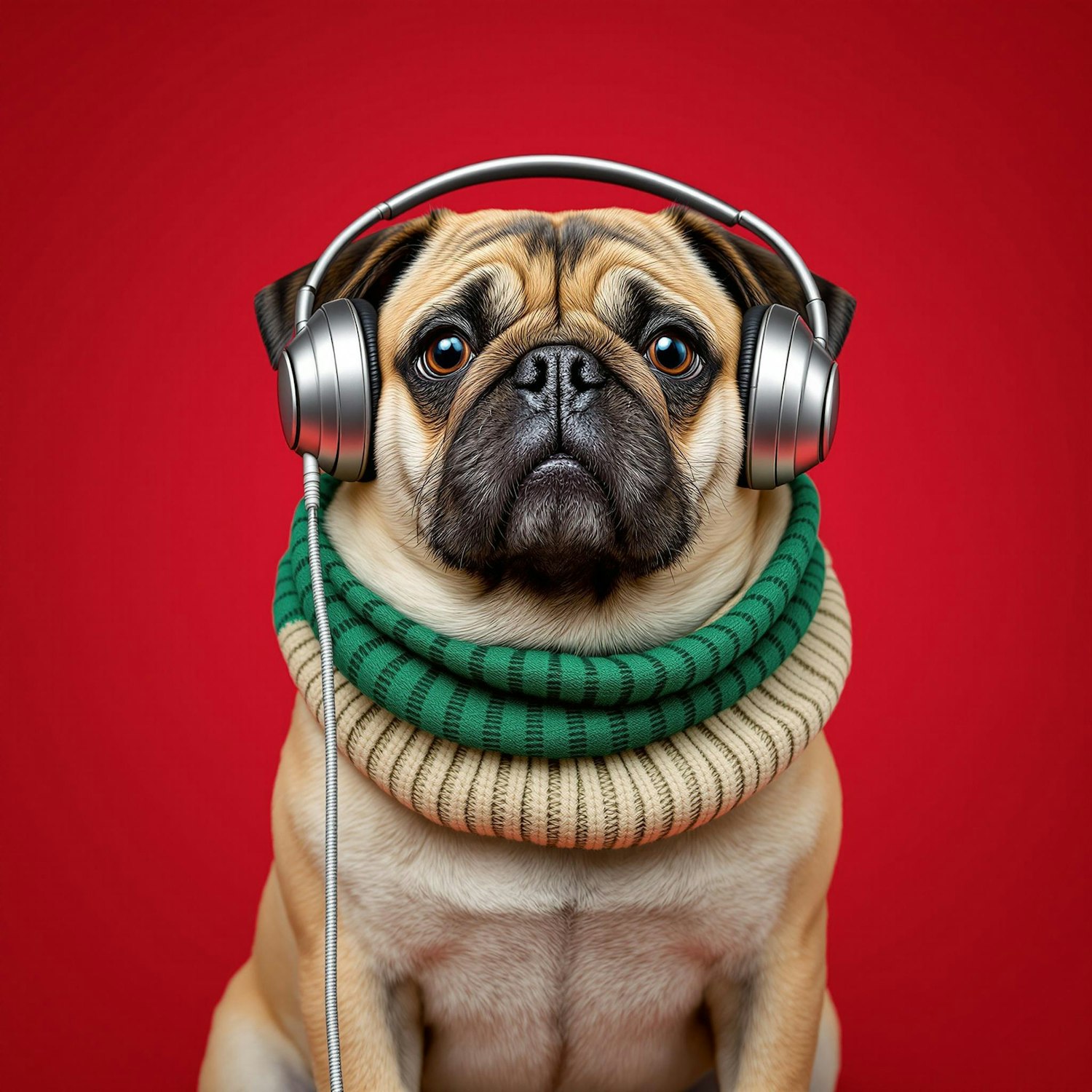 Adorable pug illustration with a green scarf and headphones on a bold red background, perfect for music and pet lovers alike.