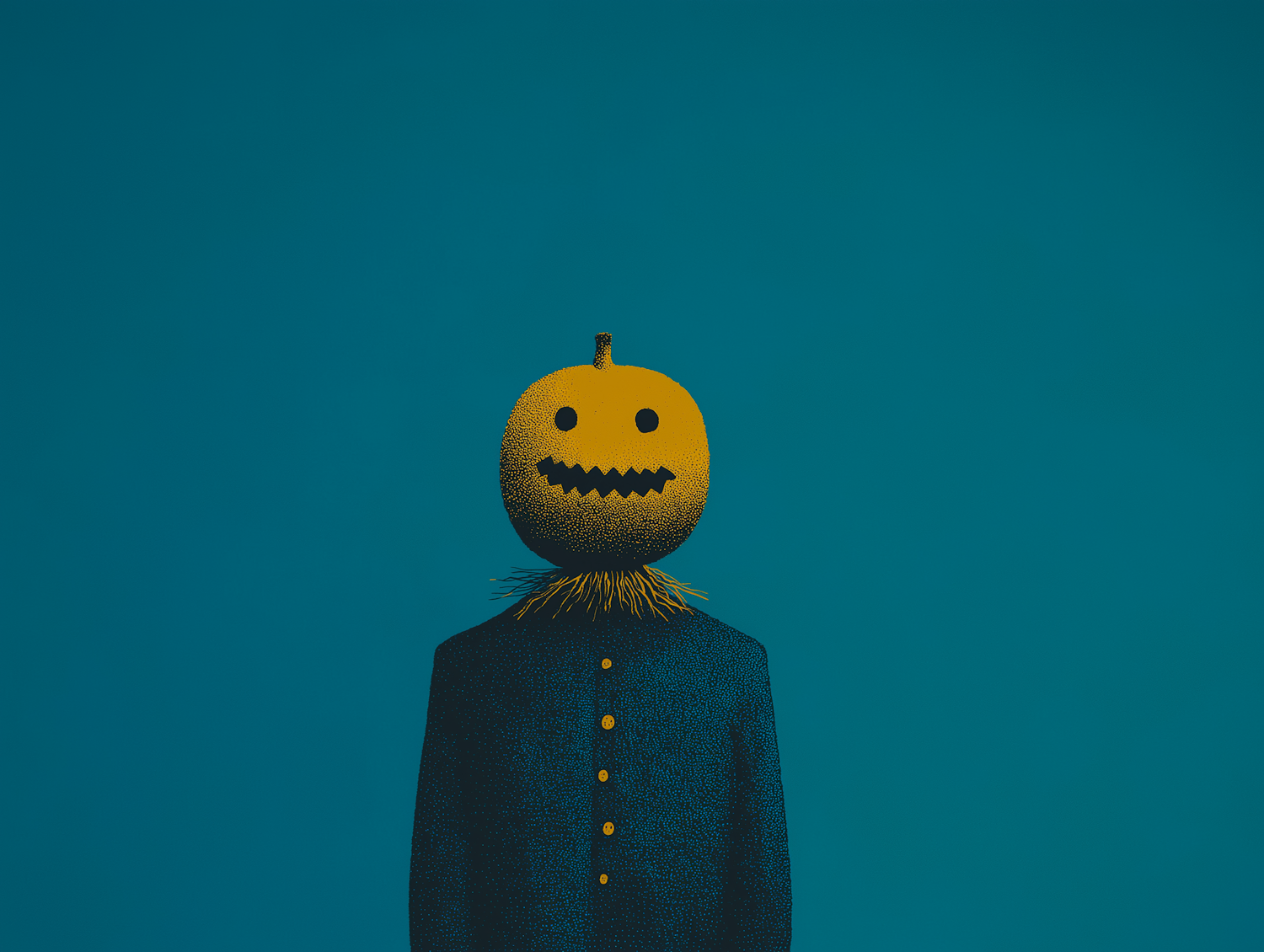 A surreal illustration of a figure with a pumpkin head wearing a dark suit against a teal background, evoking a whimsical and eerie vibe.