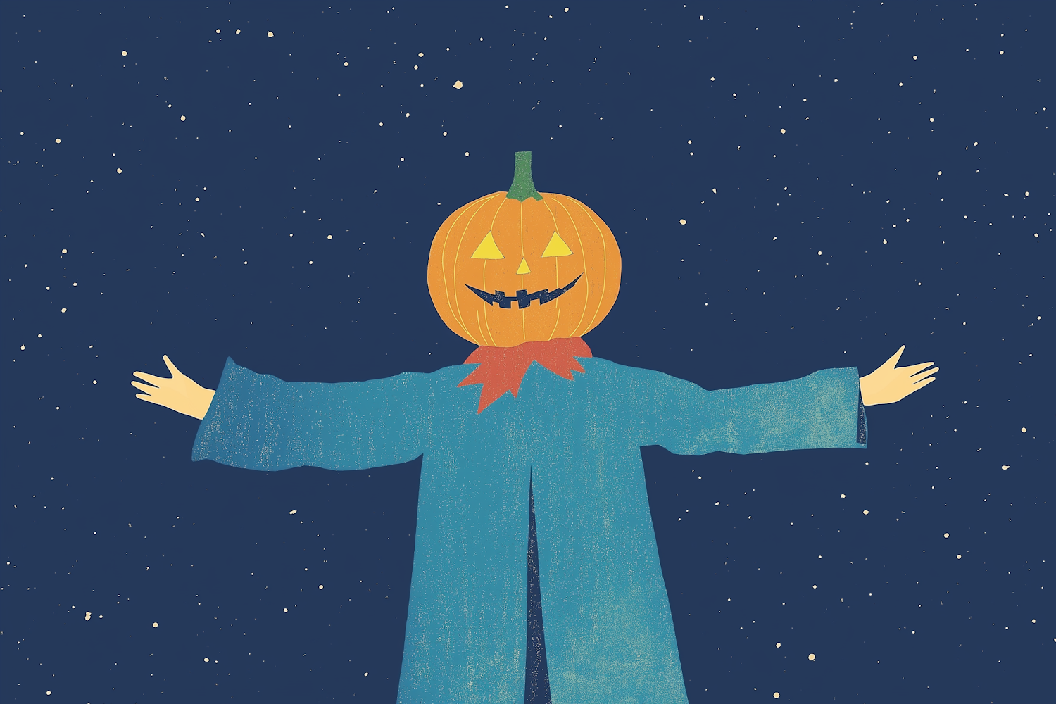 Whimsical scarecrow with a pumpkin head under a starry night sky, wearing a blue coat. Playful and magical Halloween illustration.