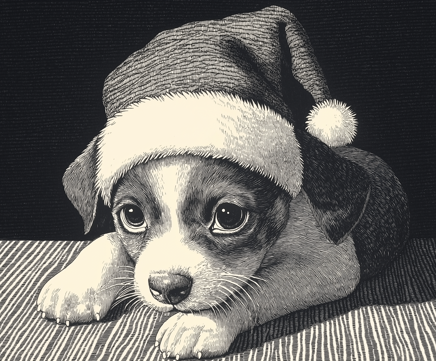 Charming black and white illustration of a puppy in a Santa hat, with expressive eyes and detailed fur texture, evoking warmth and tenderness.