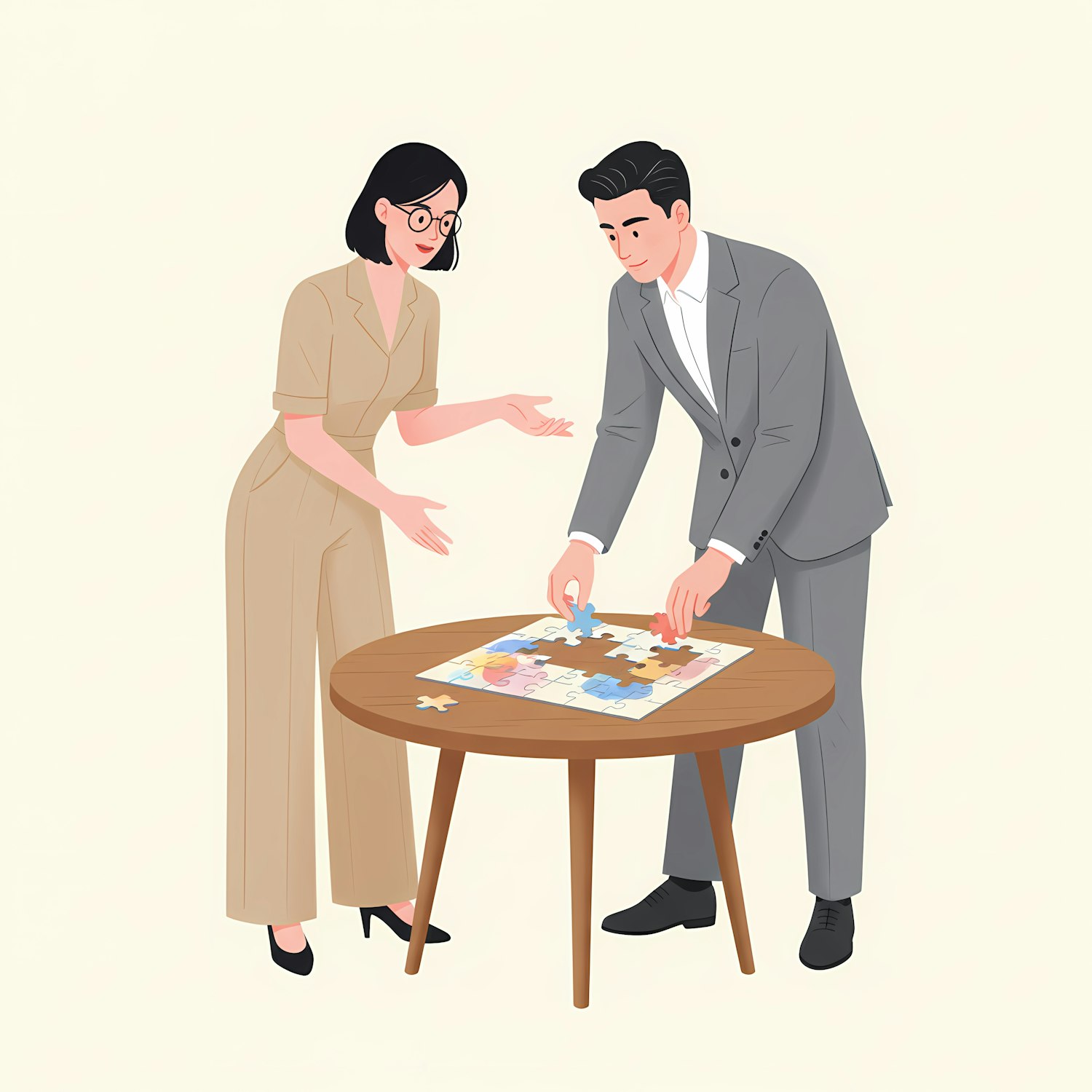 A man and woman collaborate on a jigsaw puzzle at a wooden table, showcasing teamwork and problem-solving in a light, professional setting.