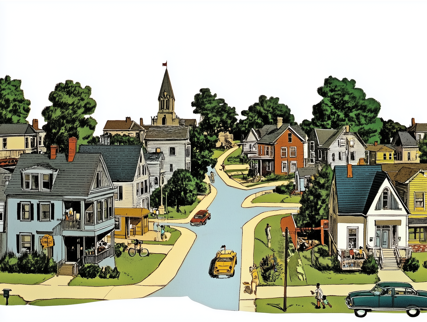 Charming suburban neighborhood illustration with vintage cars, diverse houses, and a church steeple in the background.