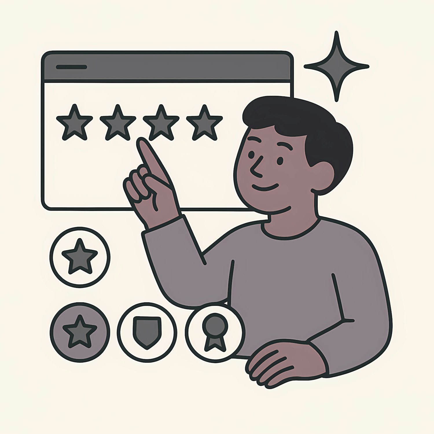 Illustration of a person pointing at a five-star rating, surrounded by icons of quality and achievement, on a light beige background.
