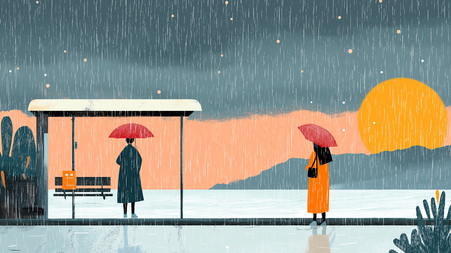Illustration of two figures with red umbrellas in a rainy scene, featuring a sunset and lush greenery.