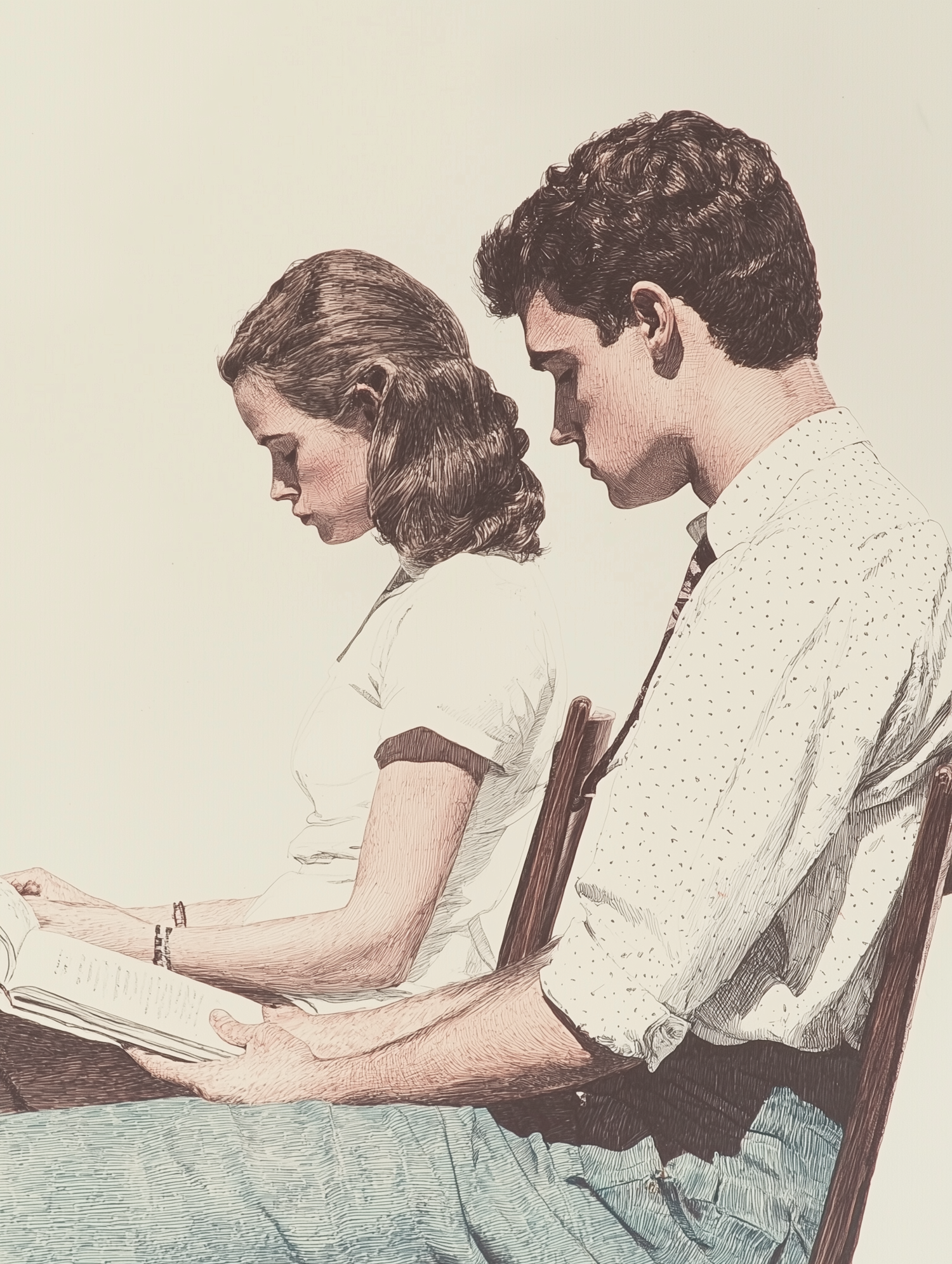 A young couple sits side by side, deeply engrossed in reading, with a focus on their expressions and attire.