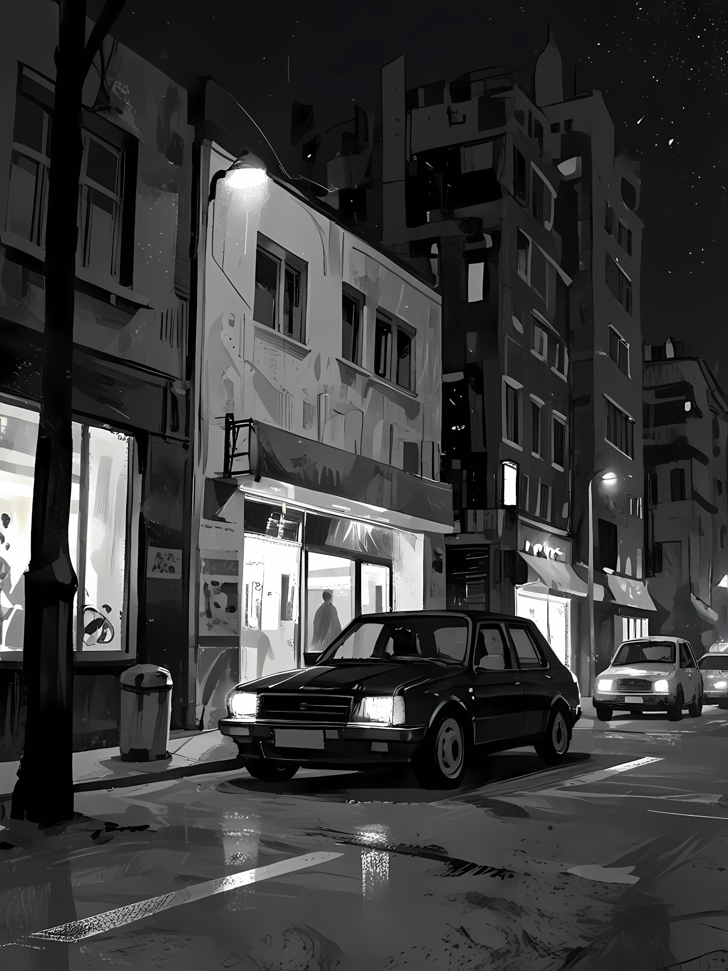 Monochrome street art depicting a nighttime urban scene with vintage cars, illuminated storefronts, and reflections on wet pavement.