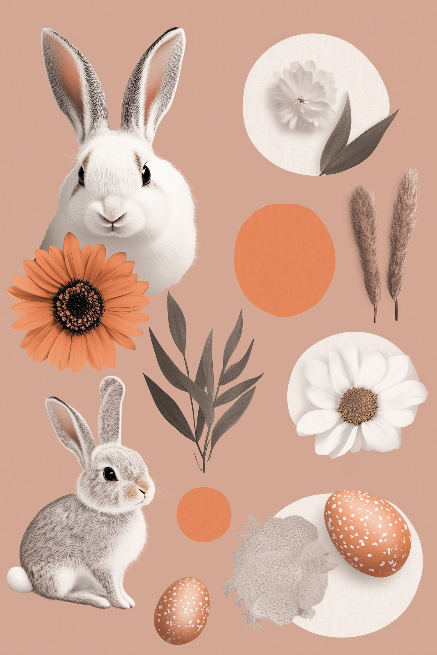 Charming illustration of two rabbits with flowers and eggs on a warm beige background, perfect for Easter-themed designs.
