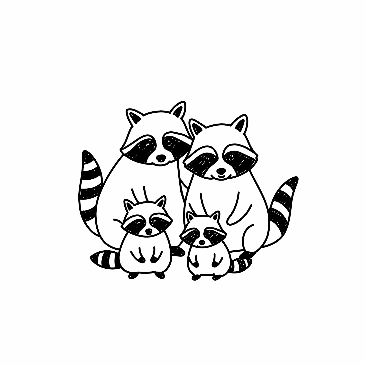 Adorable black-and-white cartoon illustration of a raccoon family, featuring two adults and two young ones sitting together on a white background.