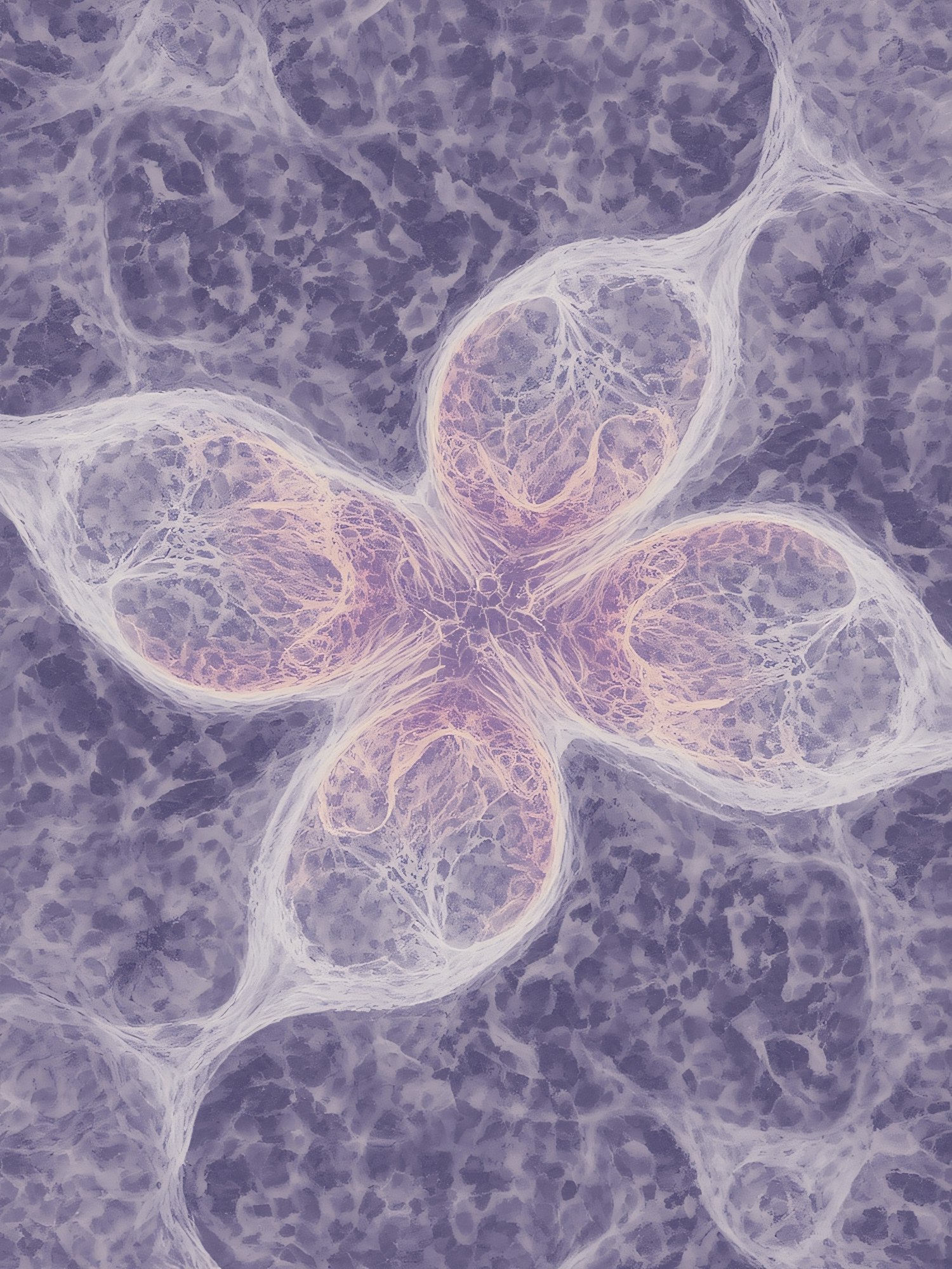 Abstract organic pattern with glowing pink and purple filaments in a symmetrical design against a textured purple background.