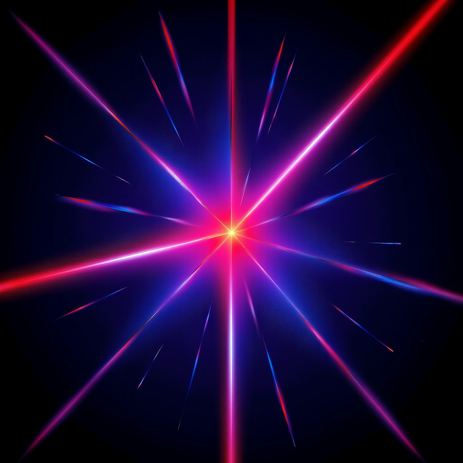 A vibrant starburst of red, pink, and blue light radiates dynamically against a dark background, creating a striking visual effect.