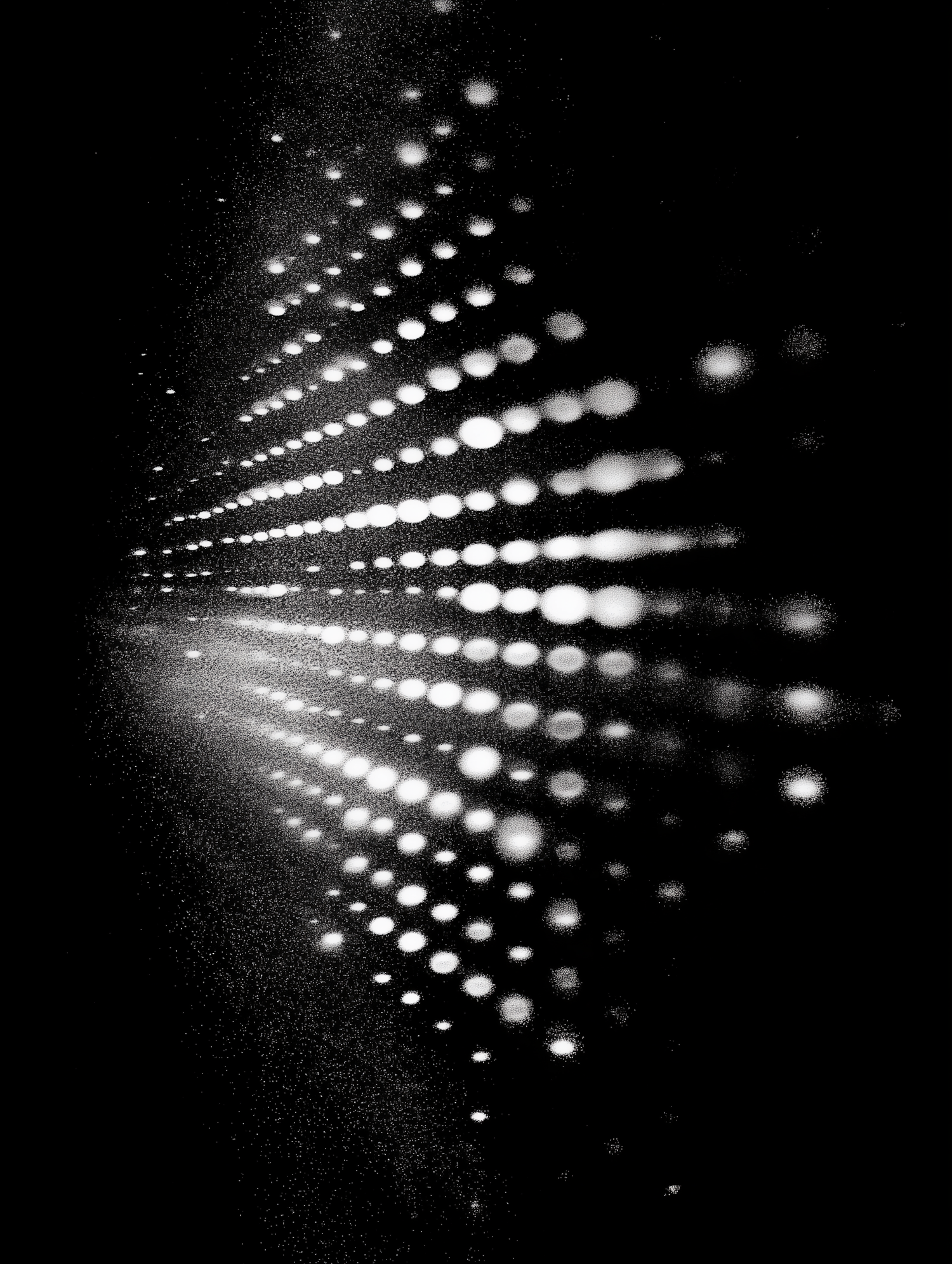 Abstract black and white image of radiating dots creating a dynamic, wave-like pattern against a dark background.