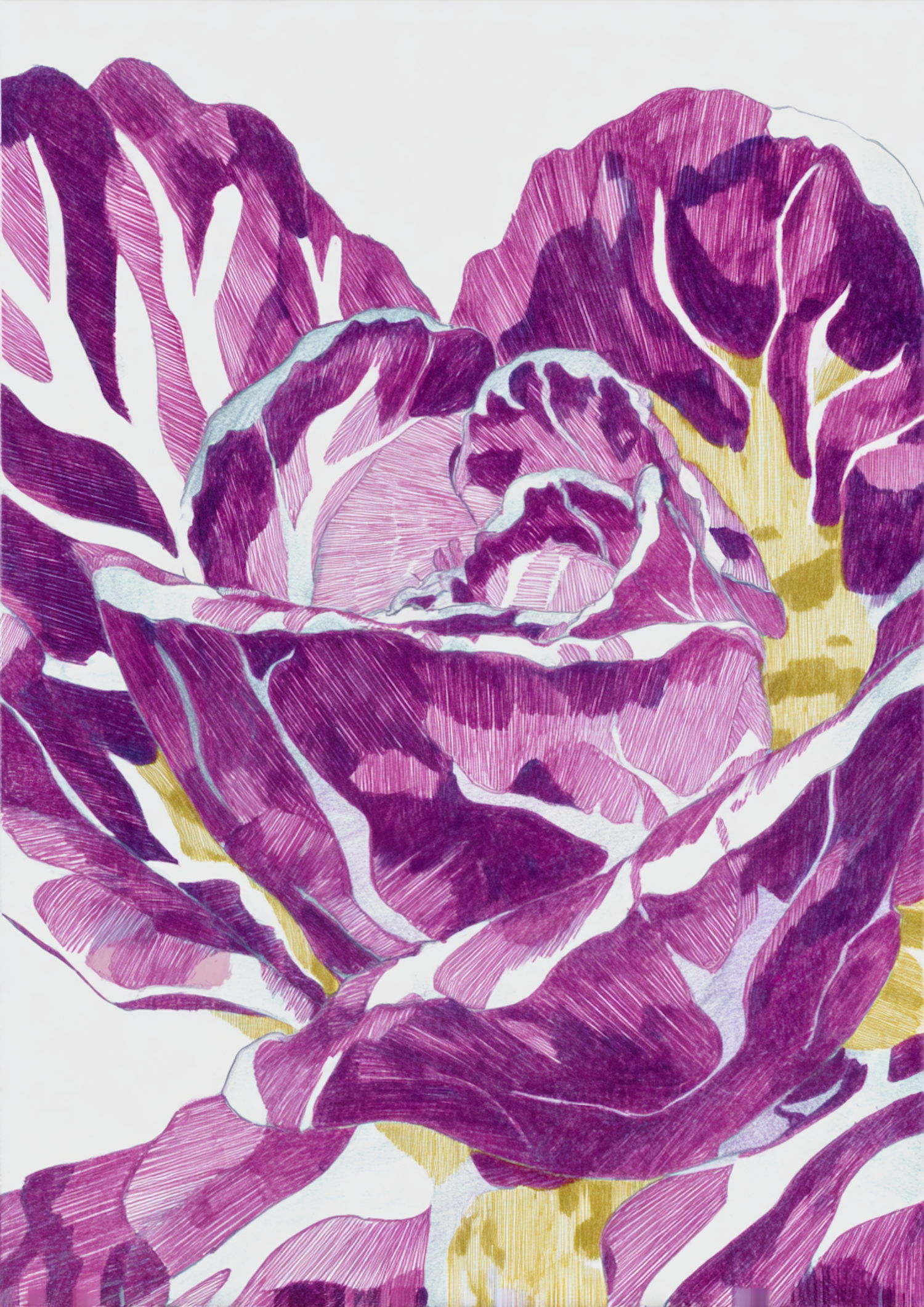 A detailed illustration of a radicchio with vibrant purple and white leaves, accented by yellow highlights, showcasing its intricate patterns.