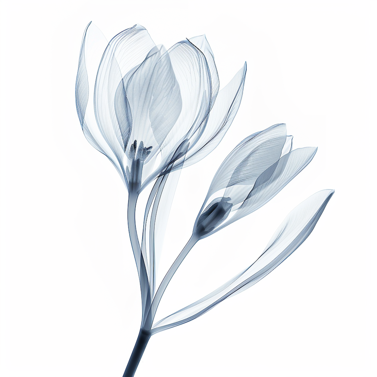 Ethereal x-ray style image of a crocus flower with translucent petals and intricate vein patterns on a white background.