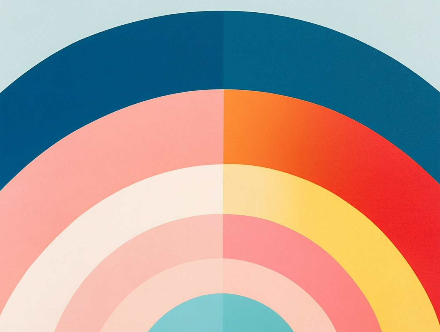 Colorful abstract rainbow arcs with a symmetrical design, transitioning from blue to red, set against a light blue background.