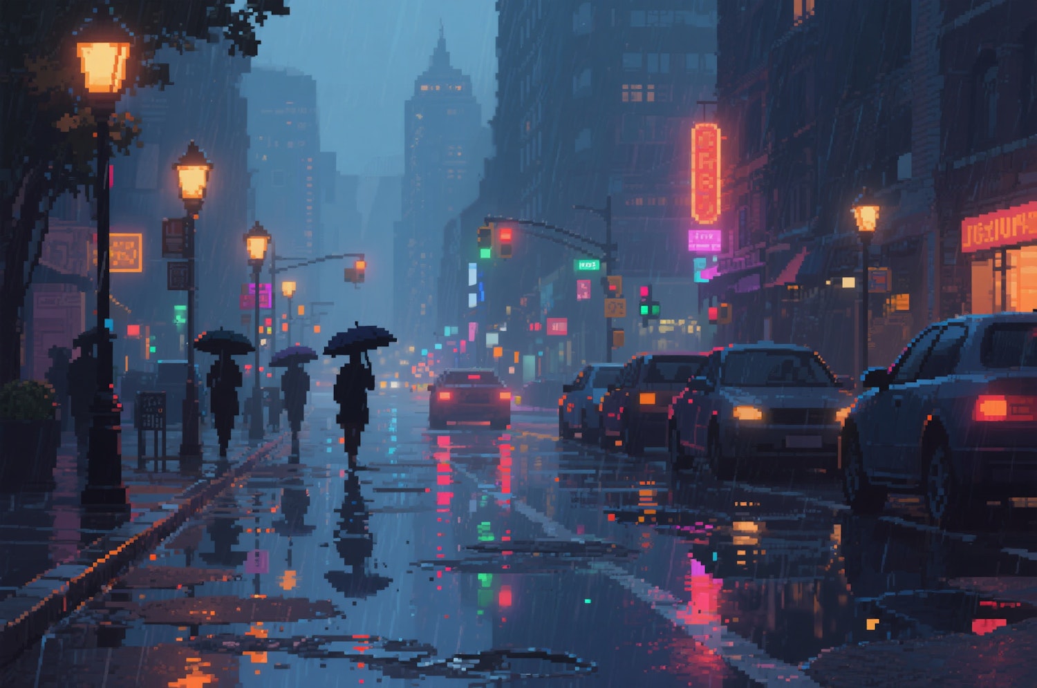 Pixel art of a rainy city street at night, with glowing neon signs, streetlights, and reflections on the wet pavement.