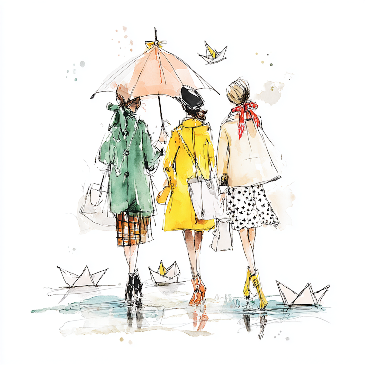 Charming illustration of three women in colorful coats walking under a pink umbrella, with paper boats floating in puddles around them.