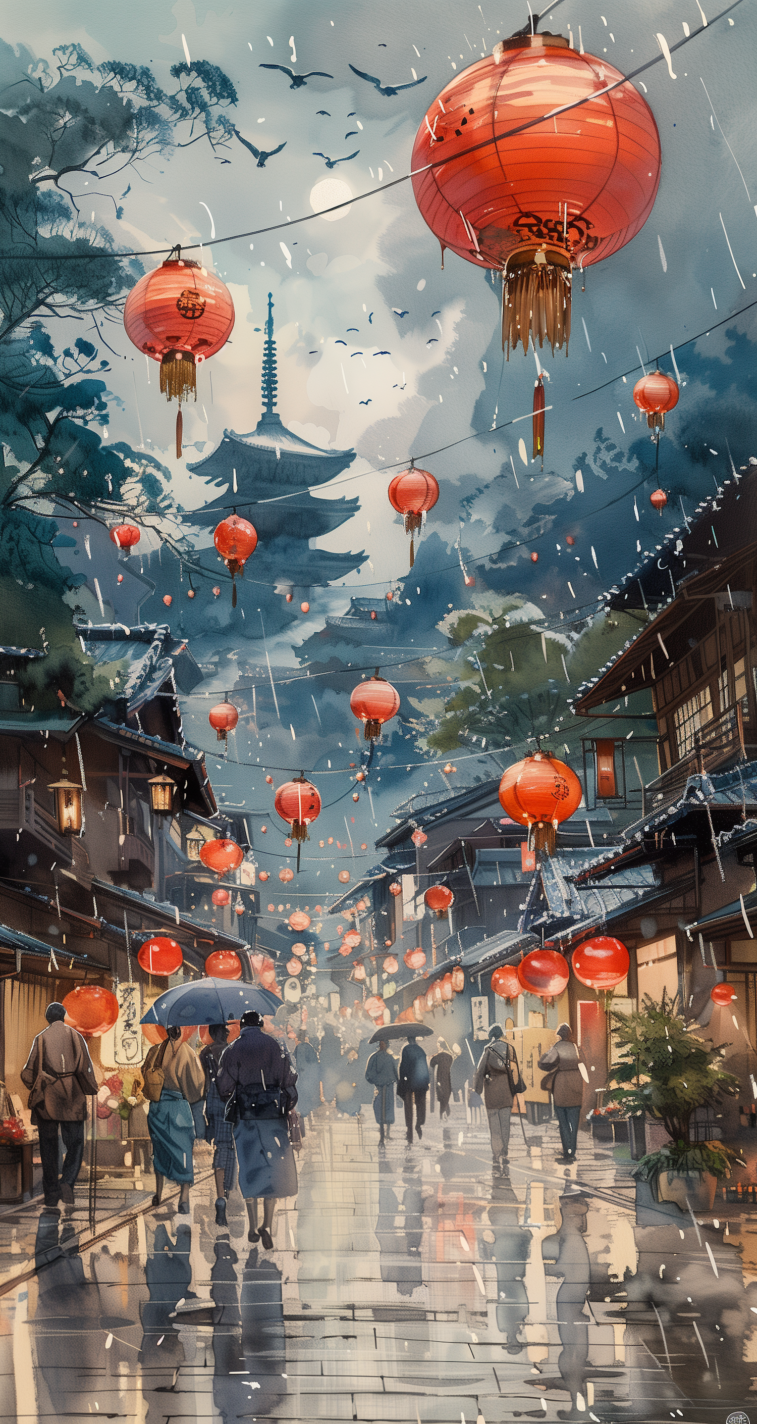 Rainy street scene with red lanterns, traditional buildings, and a distant pagoda. People walk with umbrellas, creating a serene cultural atmosphere.