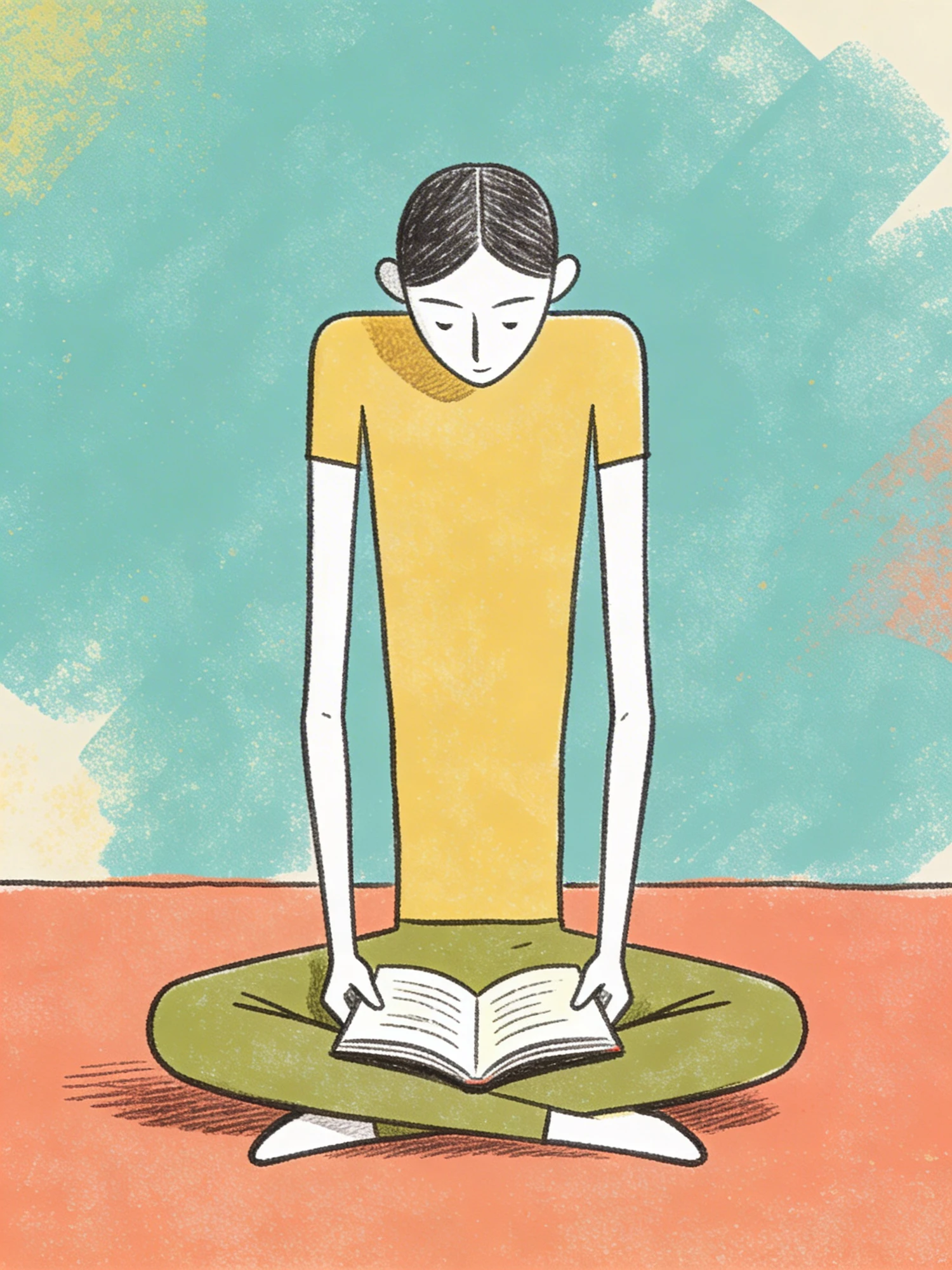 A tall, thin character sitting cross-legged on the floor, reading a book flat minimal shapes, rough pencil outlines, risograph grain, mid‑century modern colours, playful editorial style.