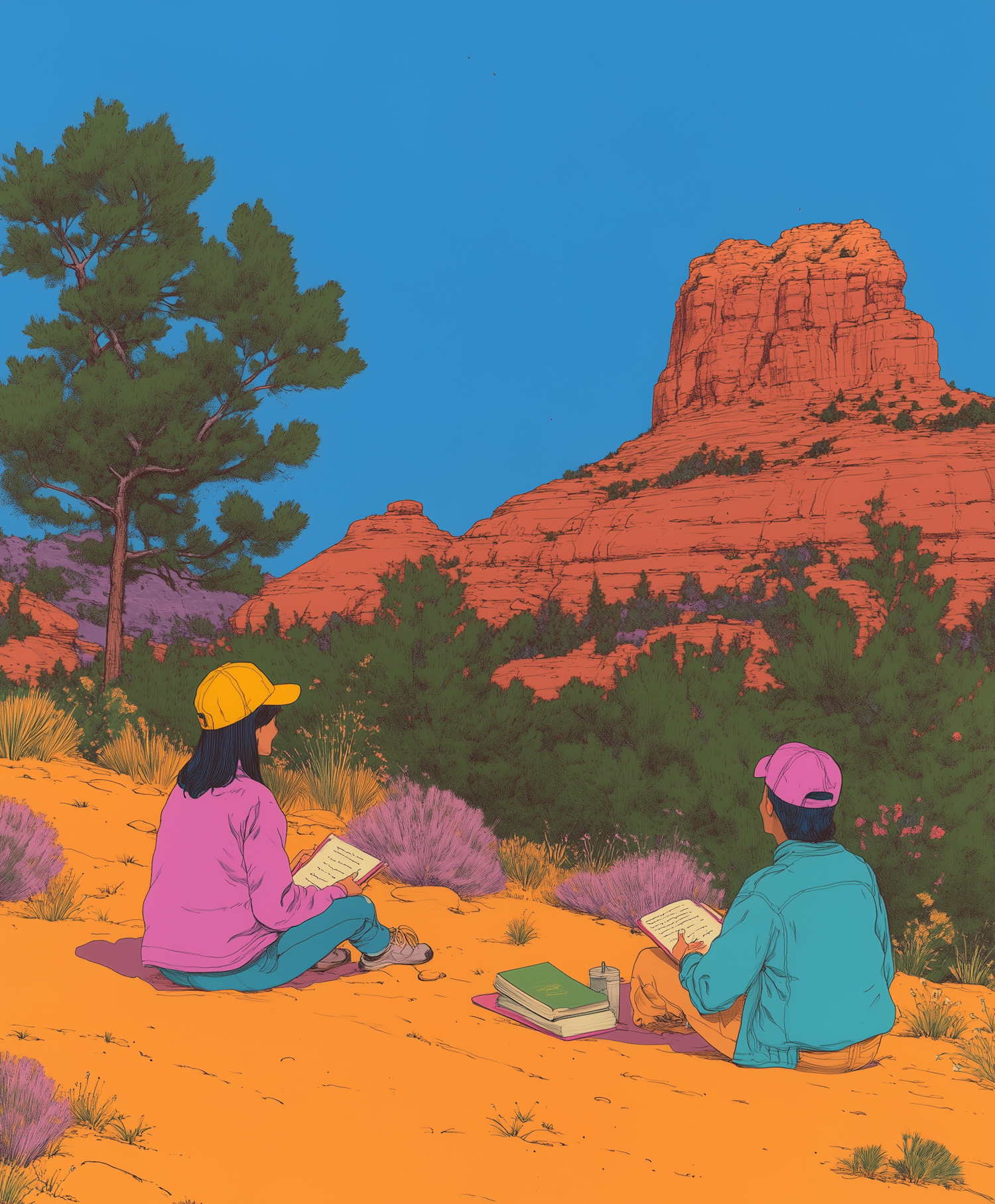 Two people reading outdoors with a stunning red rock formation and clear blue sky in the background, creating a serene atmosphere.